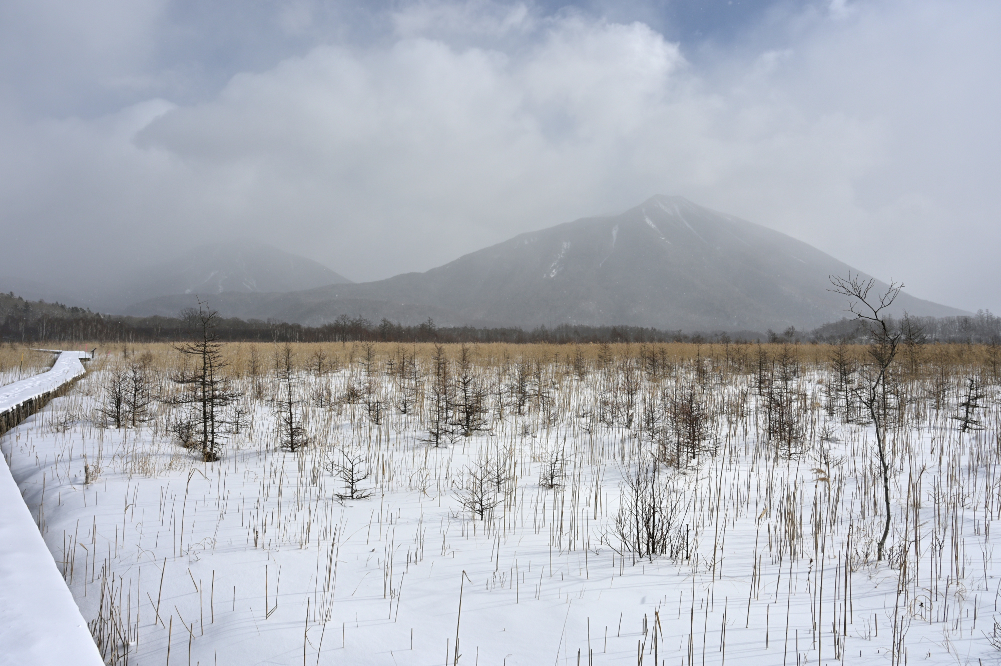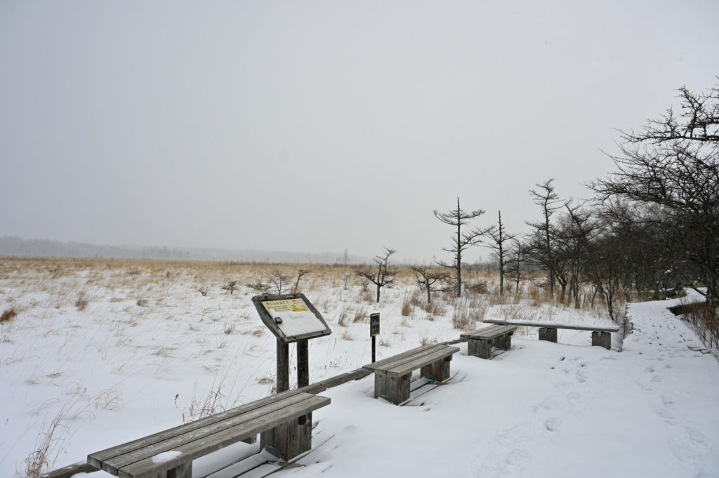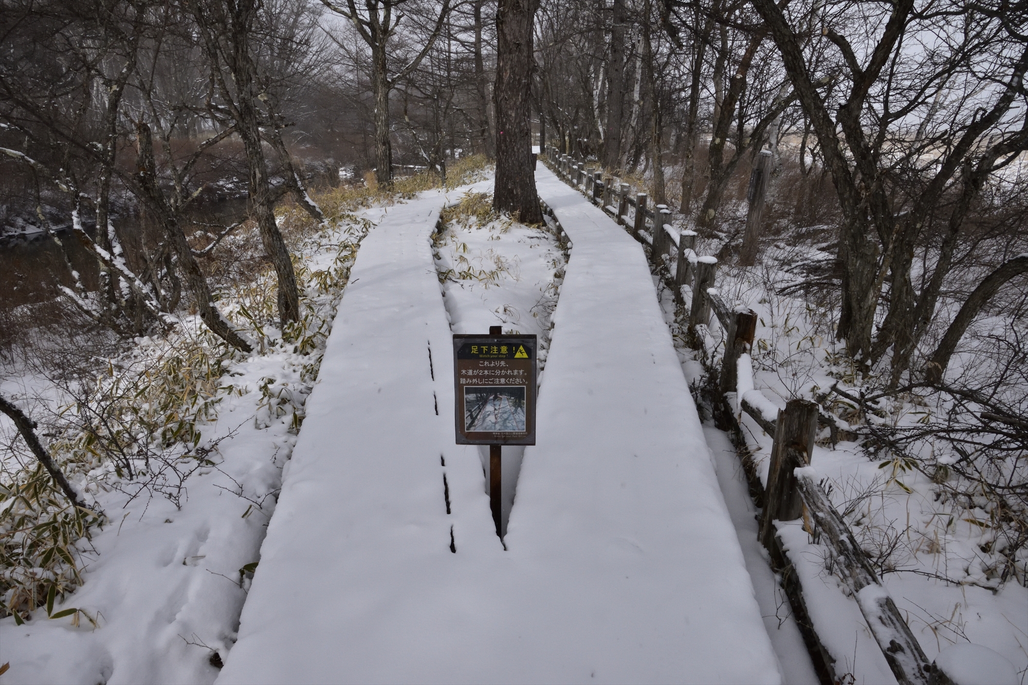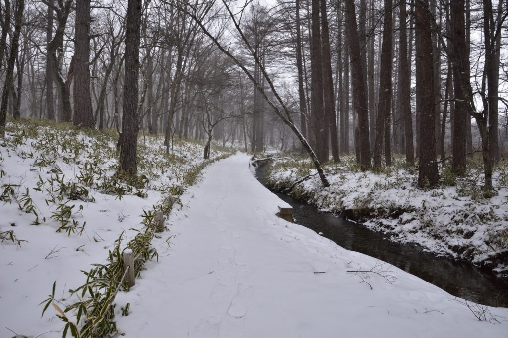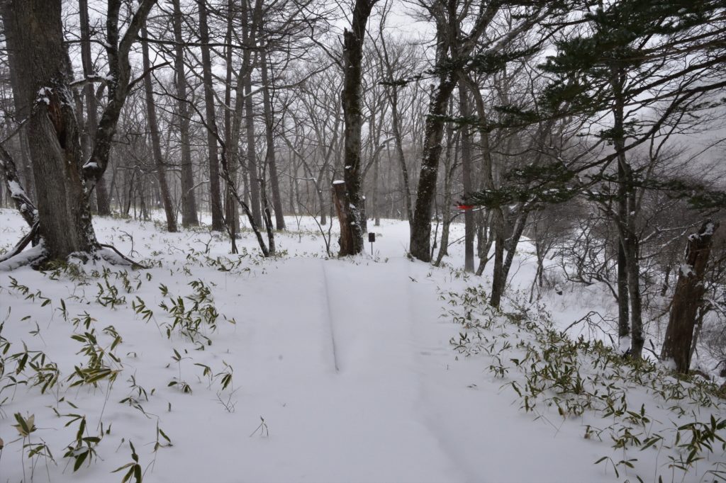 木道が分かれているところは、まだ雪に埋もれることなく見える状態。