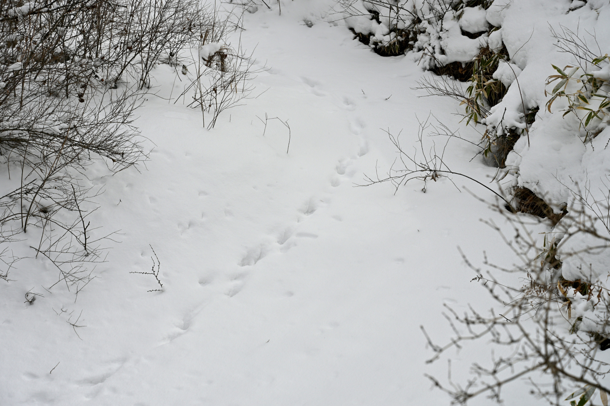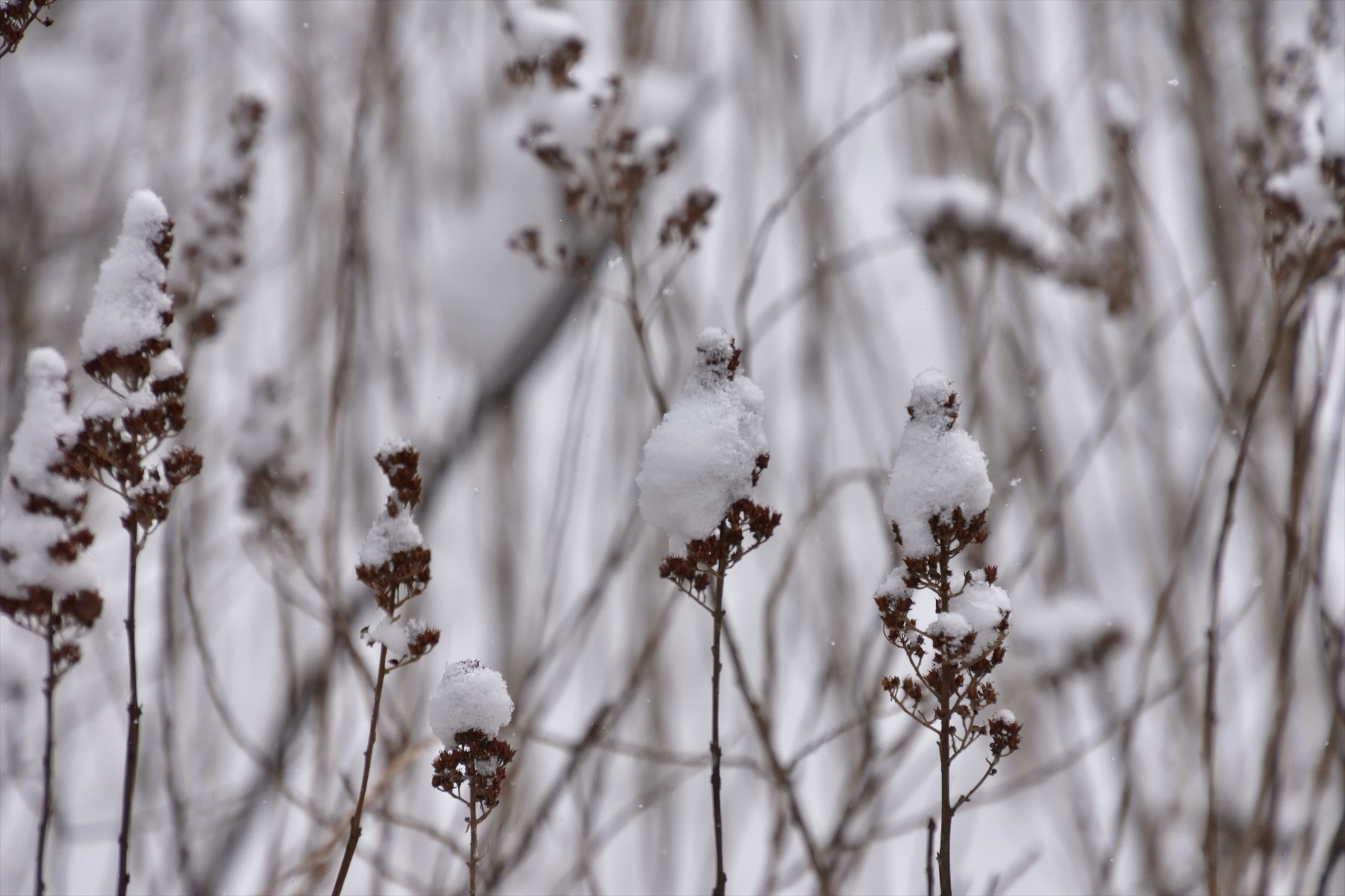 青木橋付近のホザキシモツケに雪が乗って、雪だるまやボーリングのピンに見えて可愛い感じになってました。