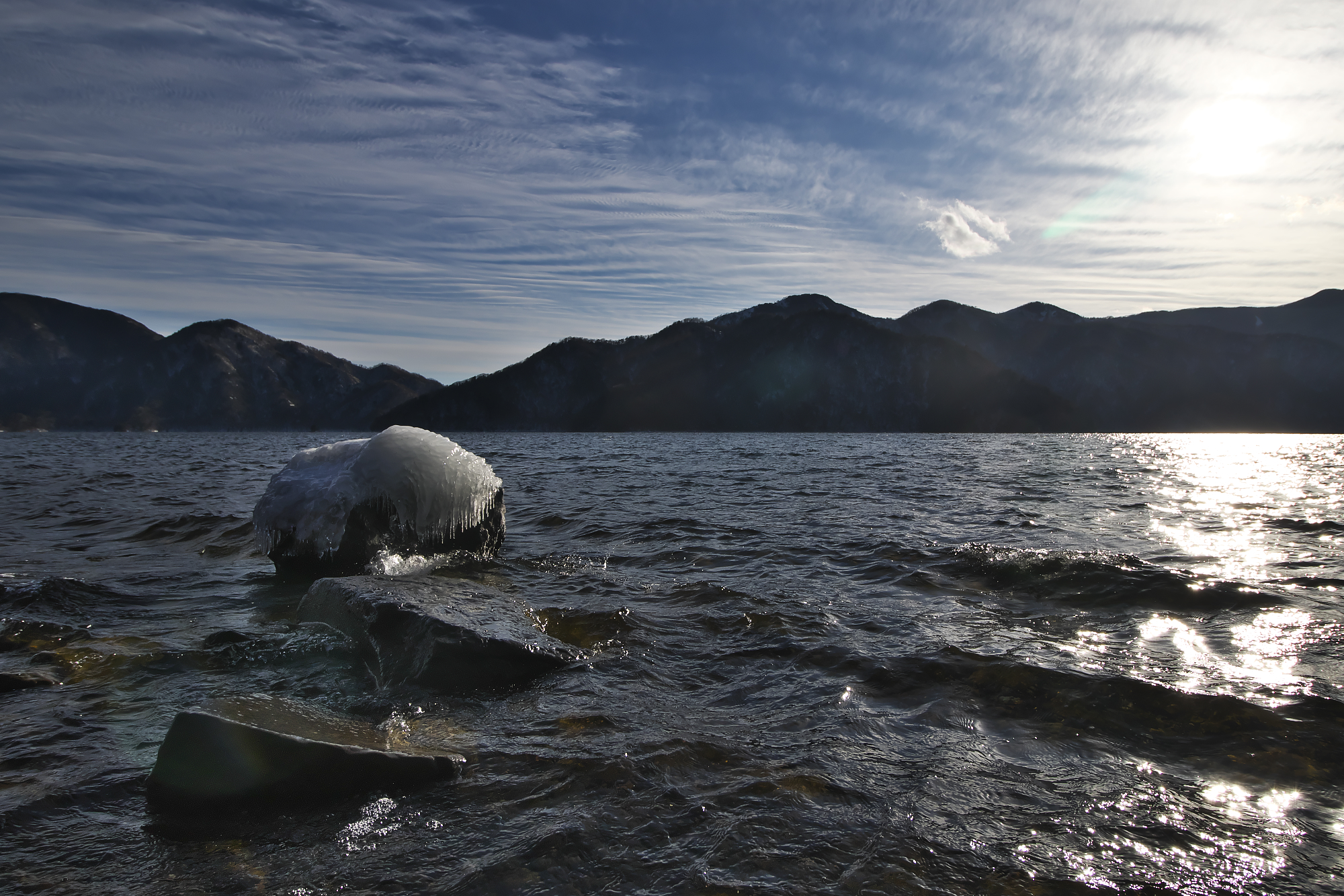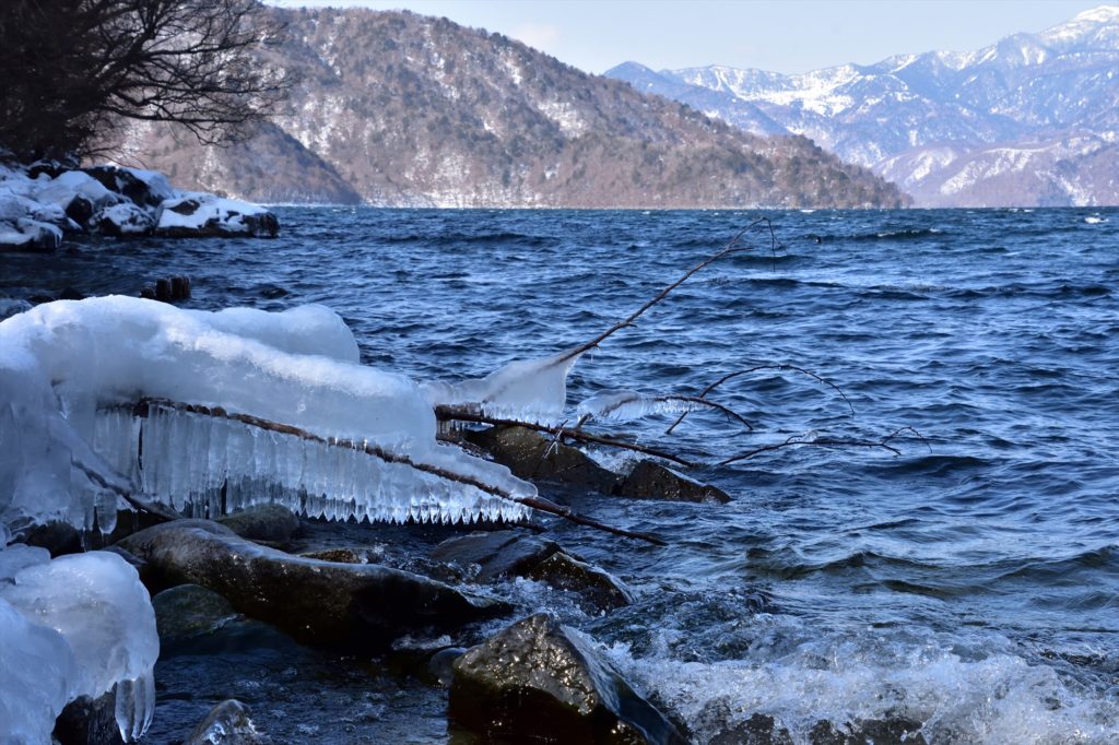 湖面沿いの一部が、美しい氷の造形となっています。