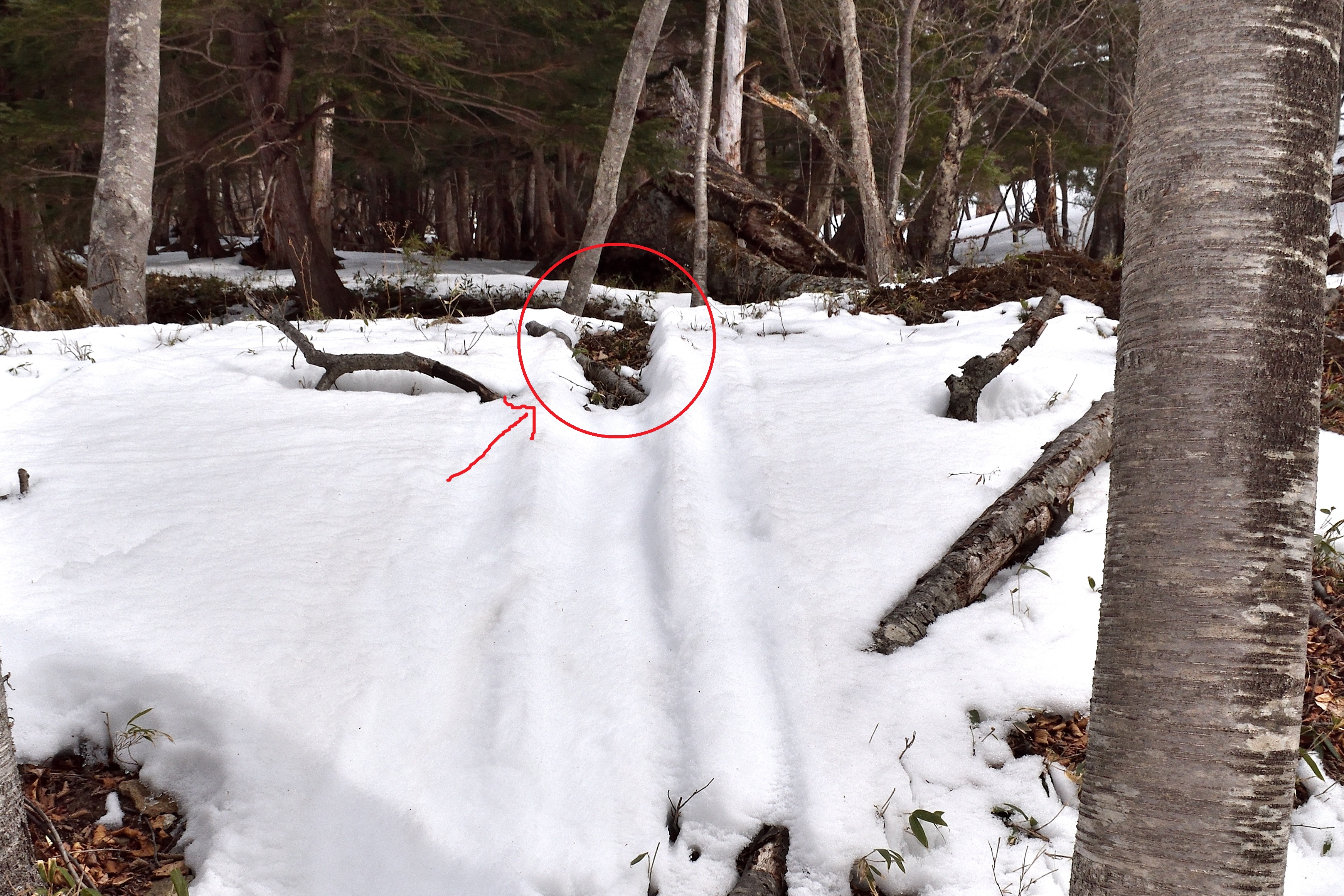 これは古いものでしたが、ご覧のとおり既にに積雪は少なく雪面も固く、