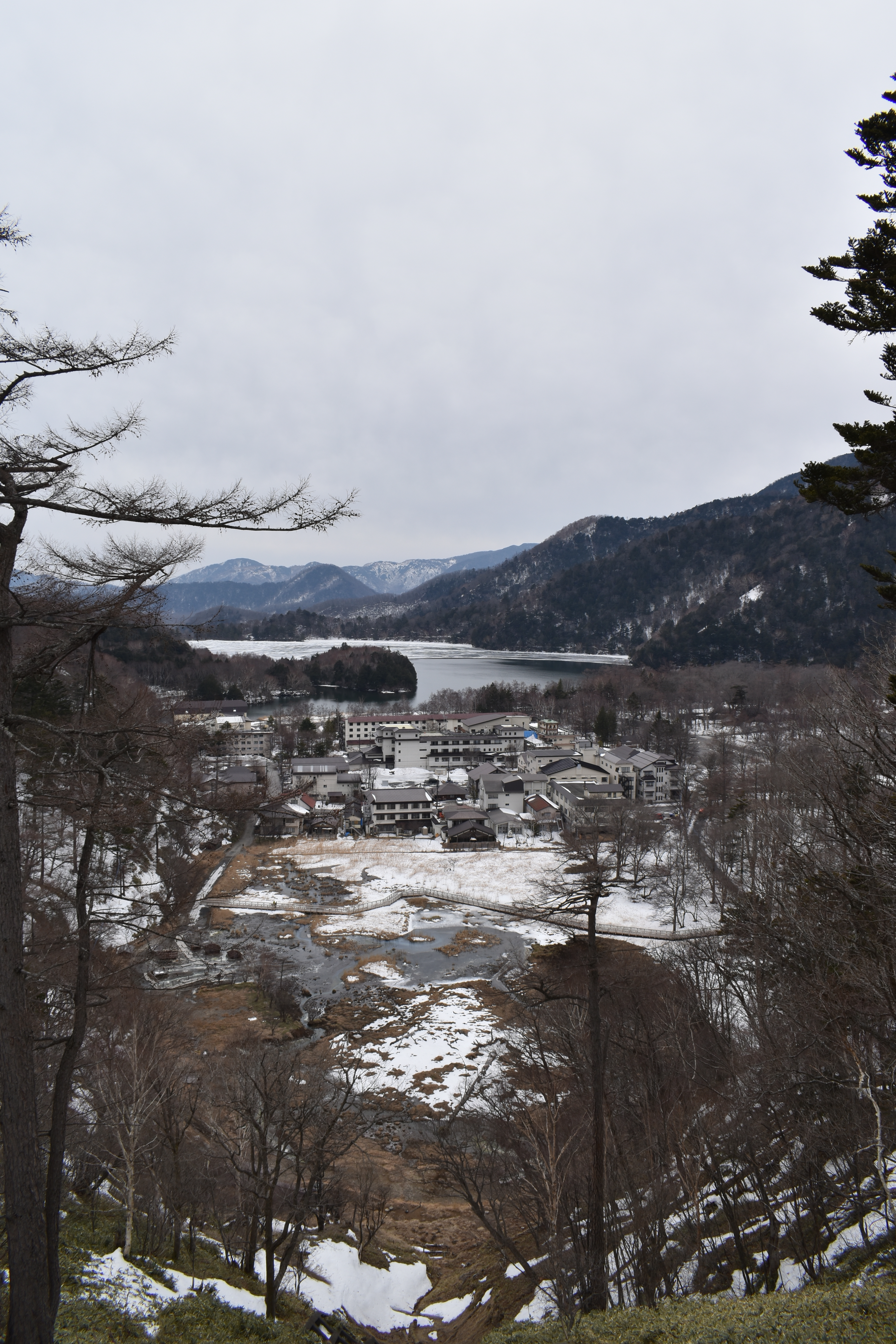 湯ノ平湿原直上の金精道路から見下ろした湯元。