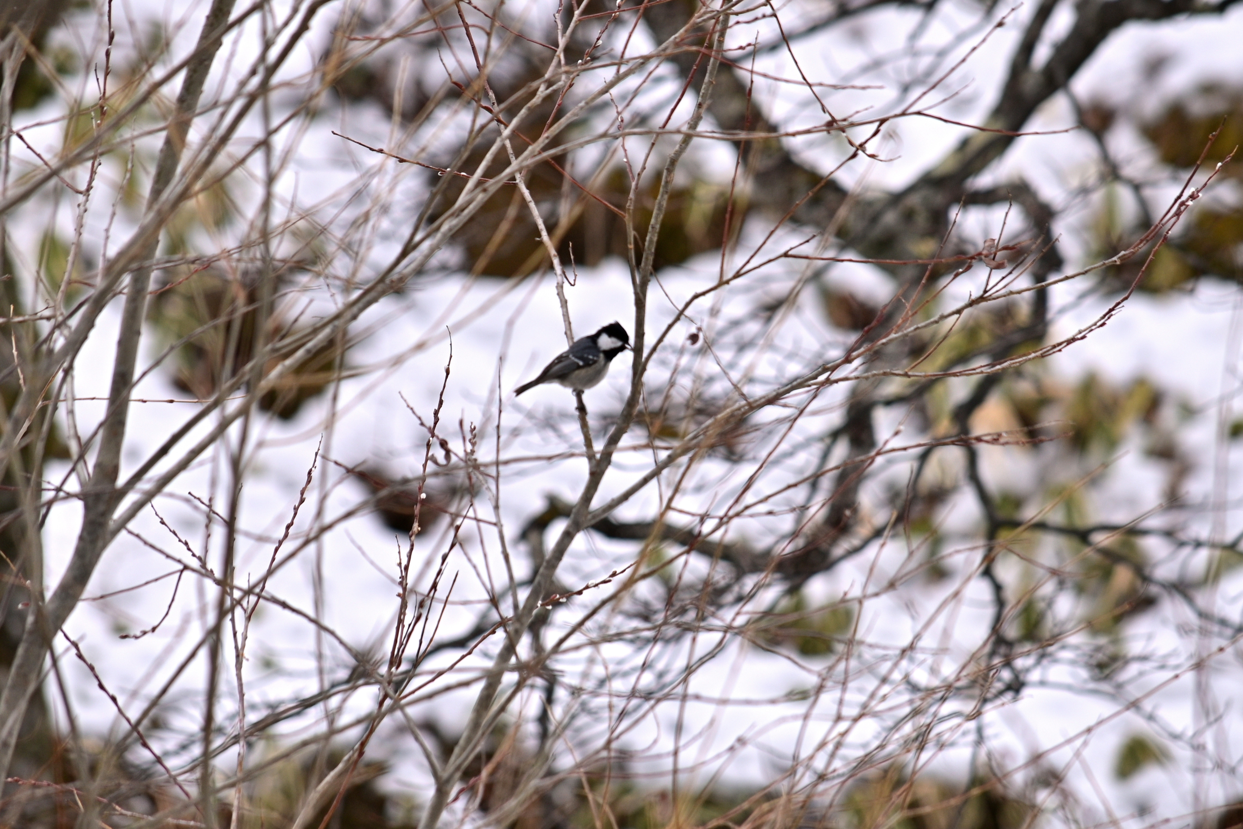 白い雪と薄黄色の枯草のまだら模様がちょっと面白い。雪解けが進むこの時期ならではの景色かも?
