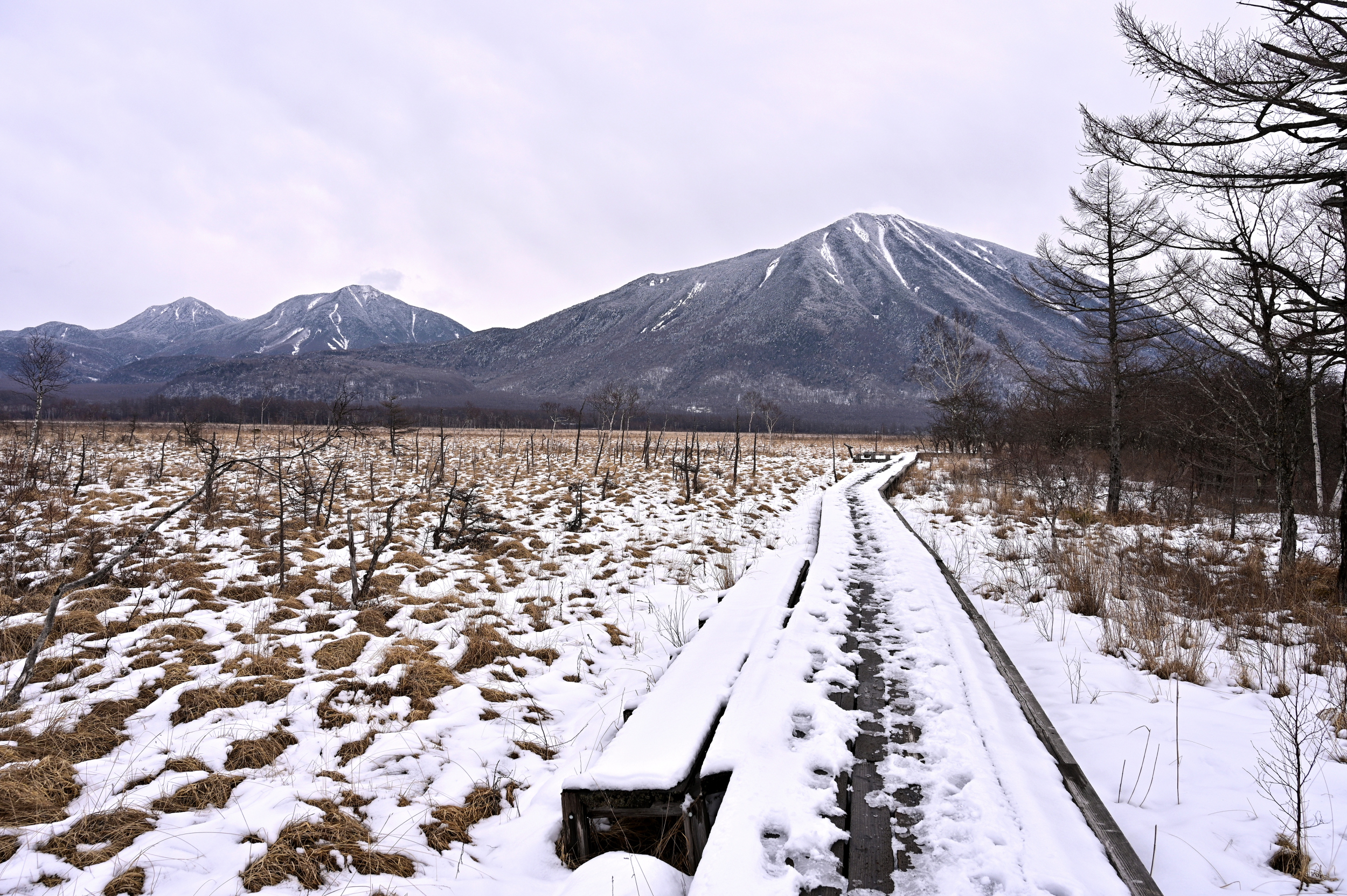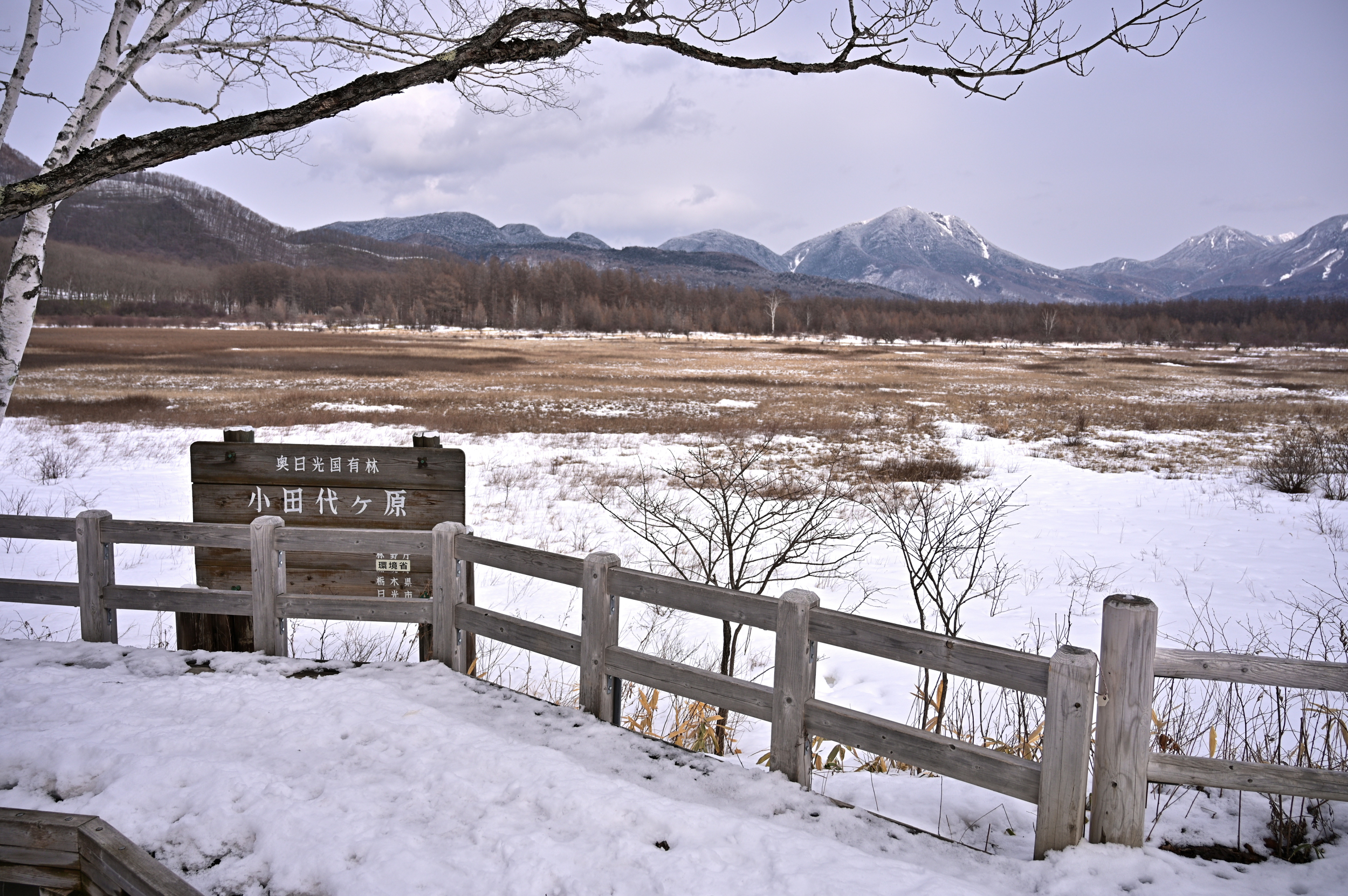 今回は少し春に近づきつつある戦場ヶ原と小田代原に行ってきました。赤沼駐車場は冬季閉鎖中なので、三本松駐車場に車を停めて、赤沼のハイキングコース入口まで約15分歩きました。当日の天気は薄い雲がかかっている空でしたが、風はあまりなく、雪化粧した男体山がくっきり綺麗に見られて、コース入口までの15分も気持ちよく歩けました。