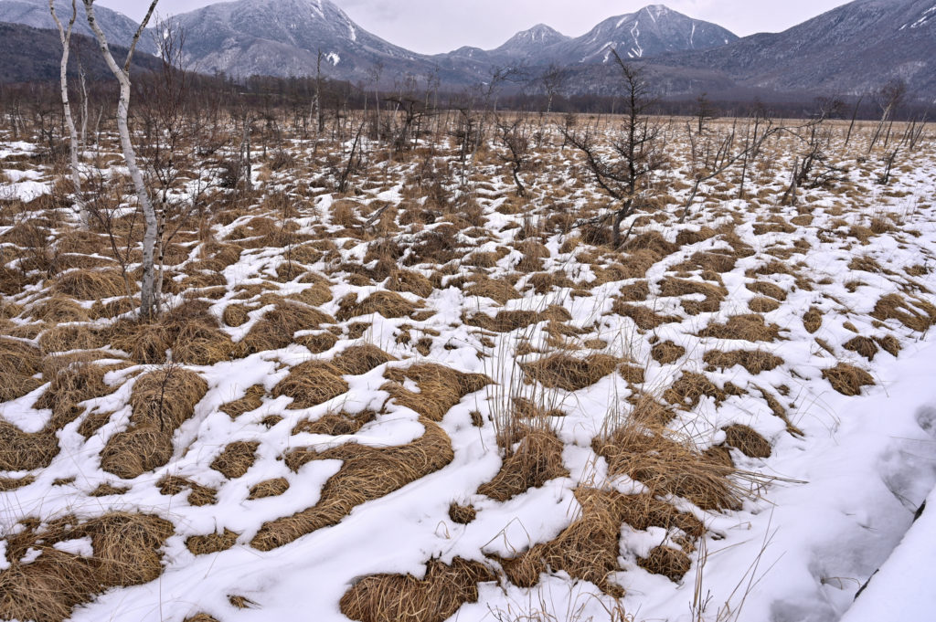 湿原上の雪が溶けて下に隠れていた枯草が顔を出しています。
