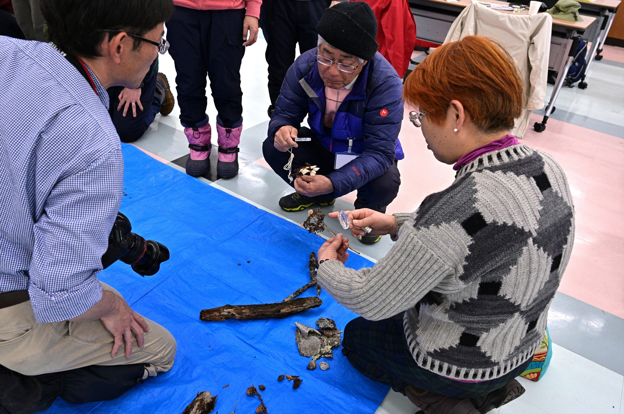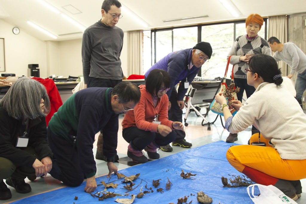 人によって興味は様々。木の皮や木の実、朽木など、持ち寄ったものを全員で共有します。