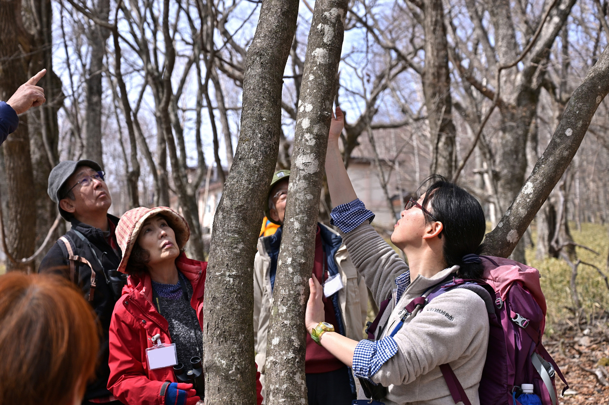 木々に残された動物の痕跡(ツキノワグマの食痕や、イタチ類の爪跡)を見たりさわったり。