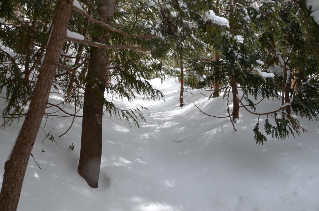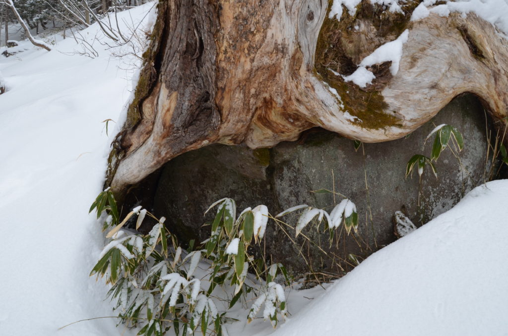 歩いている間にも雪が降り、また時々吹く冷たい風が木々に積もった冷たい雪を運んできます。こんな時には風や雪を遮ってくれる岩や木は頼もしい味方となります。