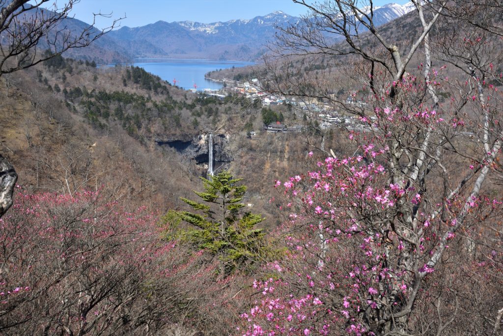 少しわかり辛いですが、眼下の華厳渓谷各所でアカヤシオが咲き、見頃に入っています。
