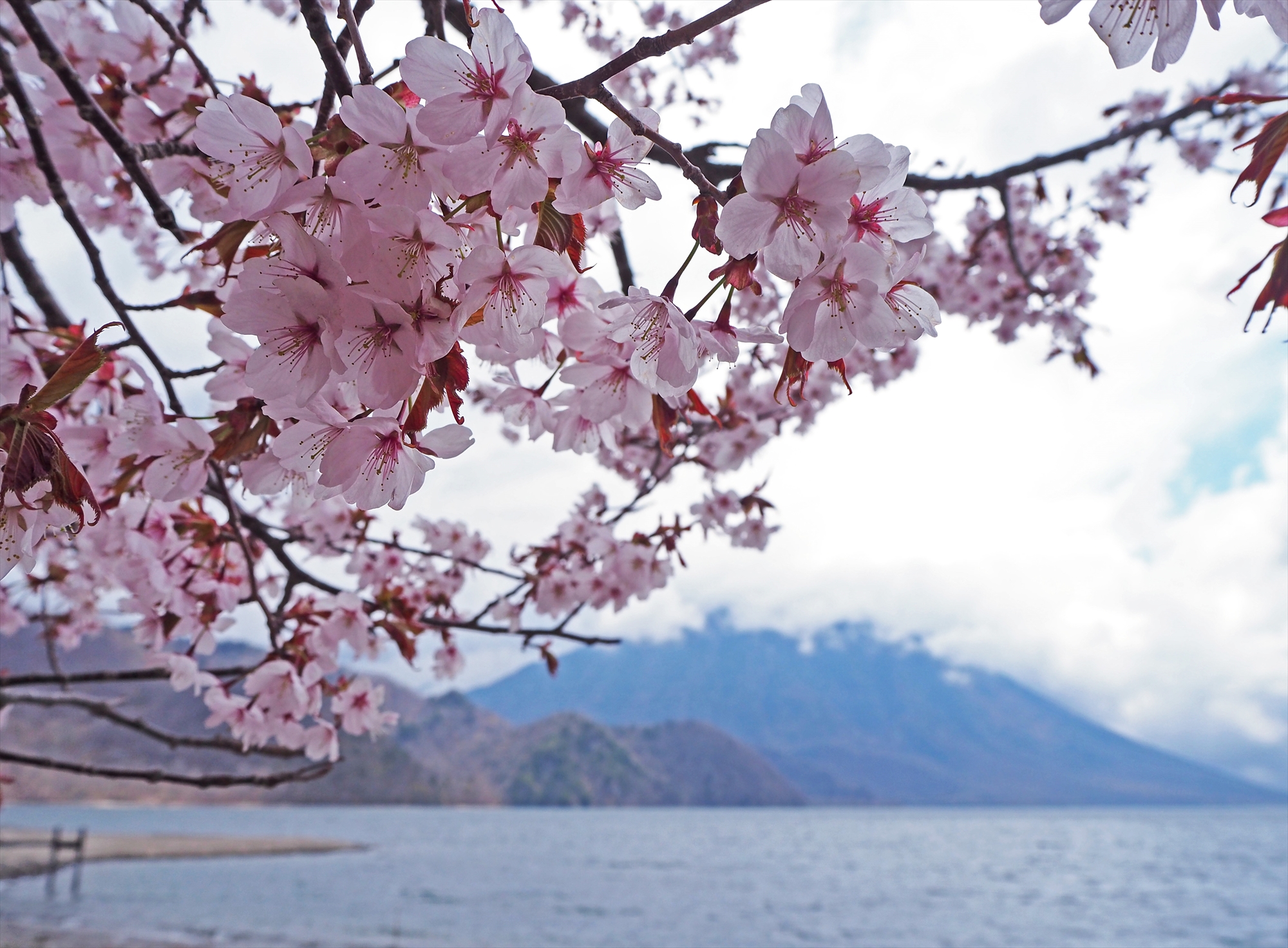 中禅寺の街の植栽はすでに葉桜となっているものがほとんどですが、千手ヶ浜のオオヤマザクラは、今がまさに満開・見頃ピーク!