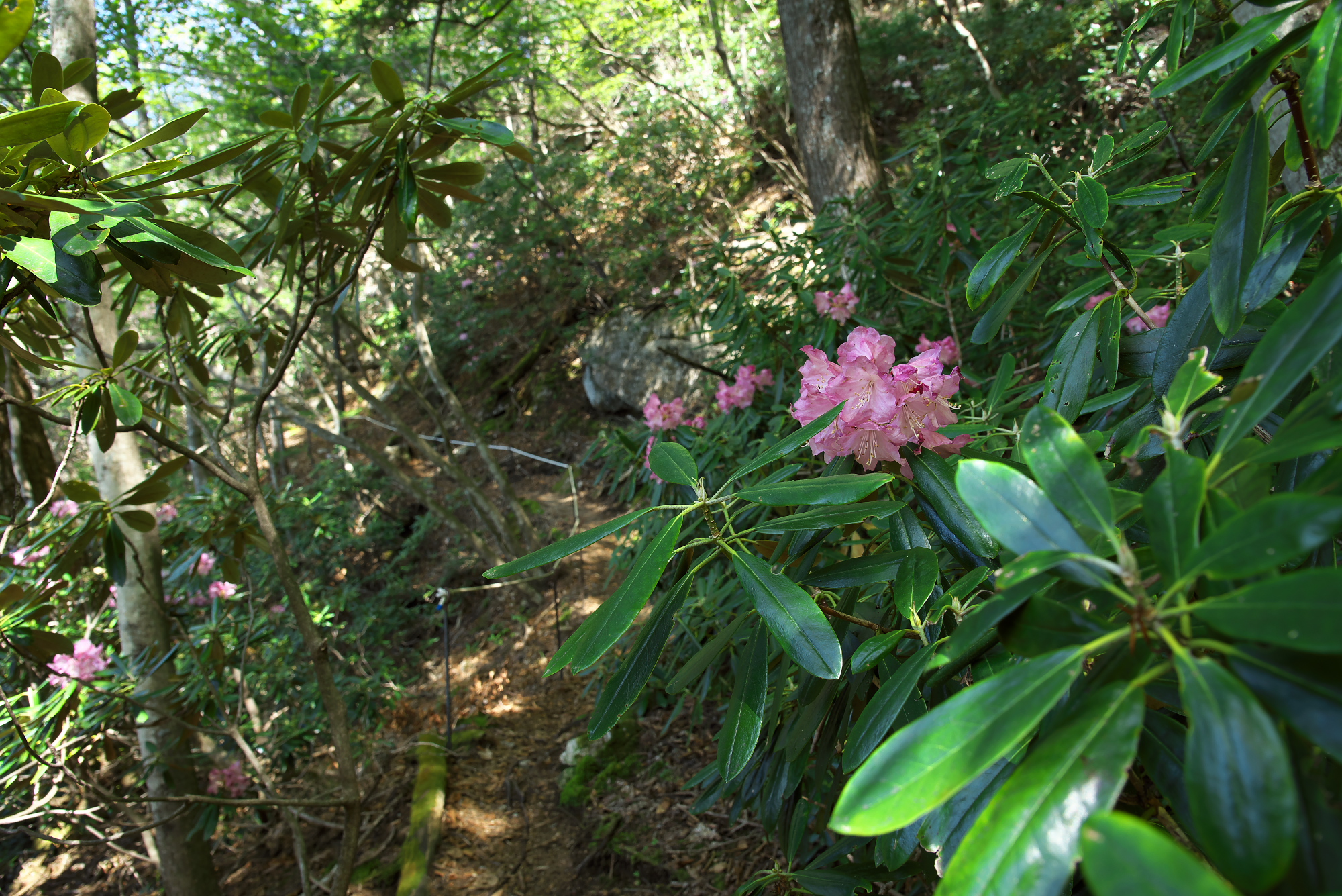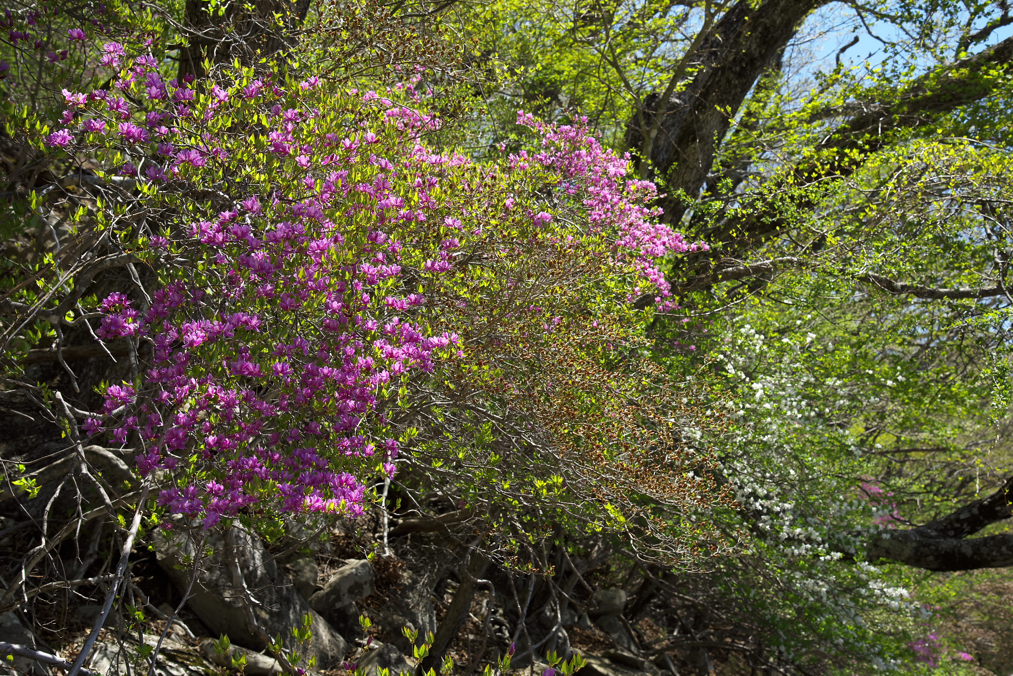 アズマシャクナゲが見頃。北岸のトウゴクミツバと同様につぼみはあるが(・・・以下同文)、早めにご覧ください。(仲)
