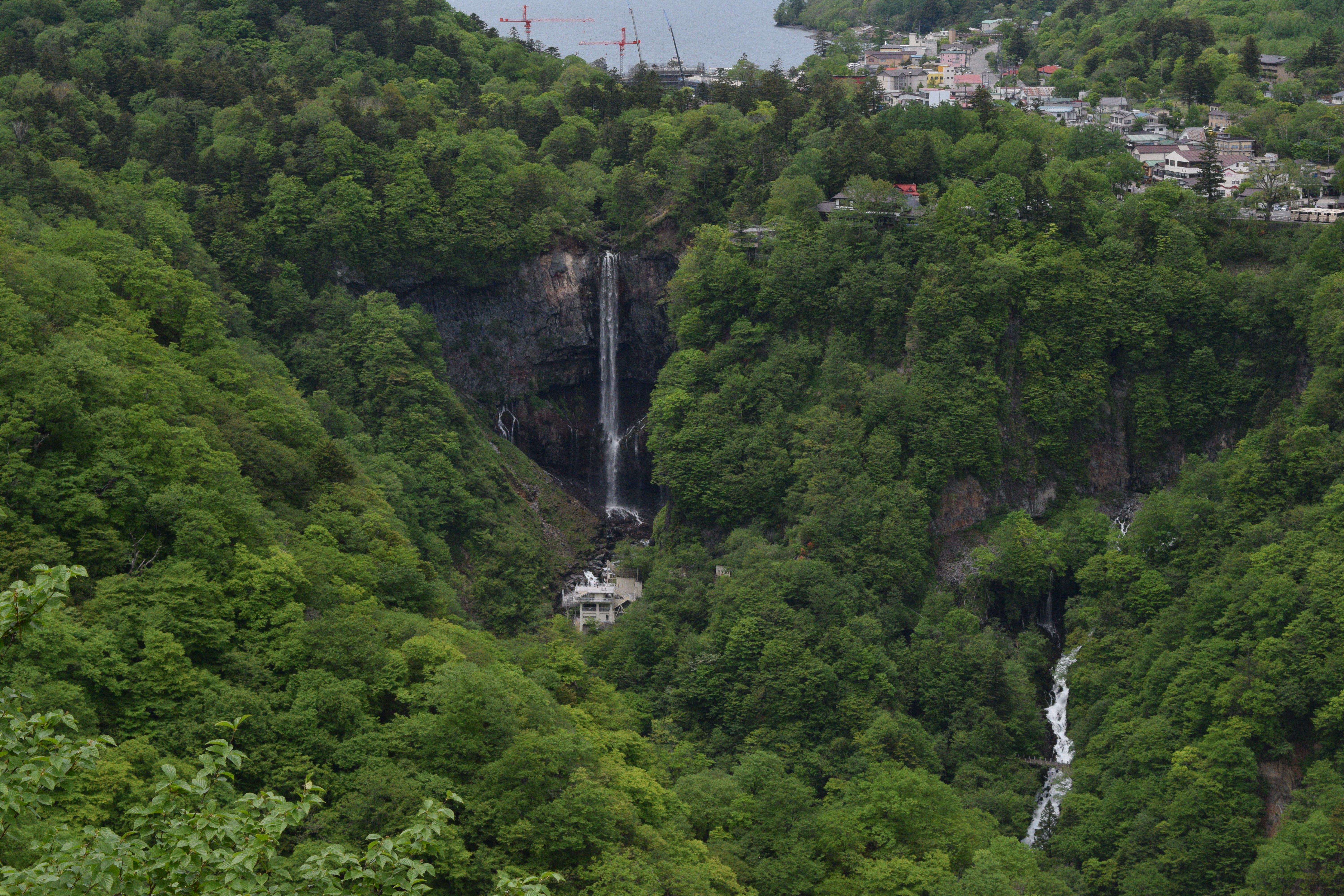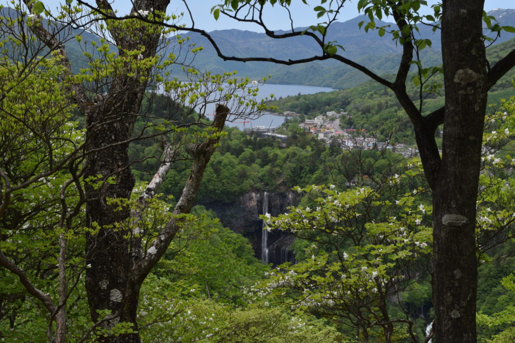 新緑の緑にシロヤシオと華厳滝が映えた美しい景色を楽しむことができます。