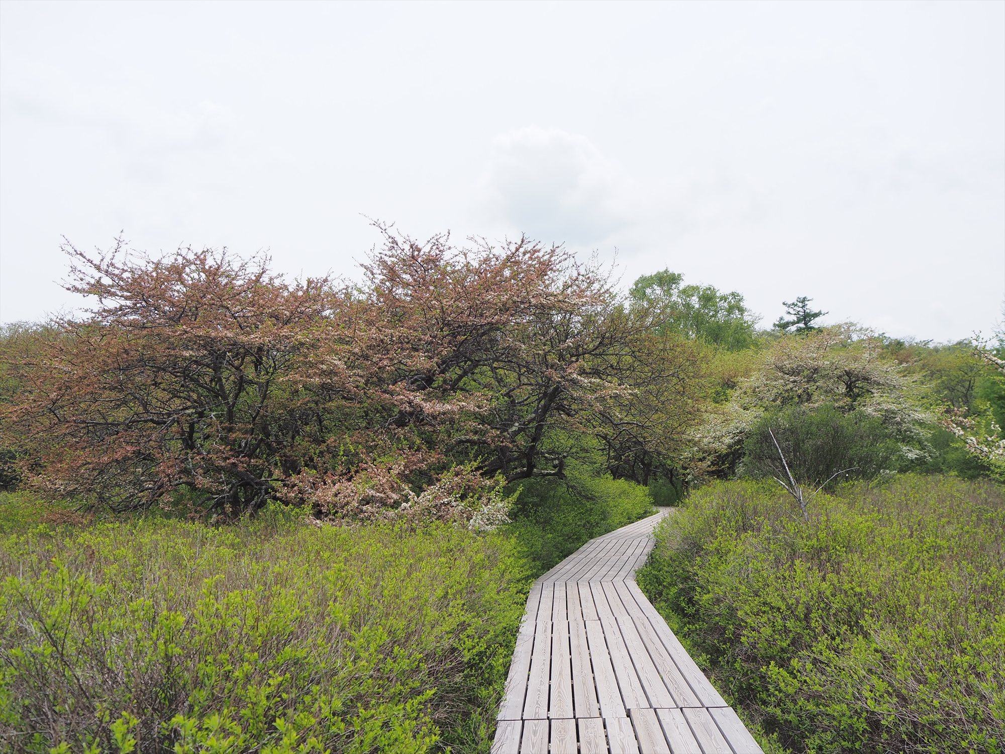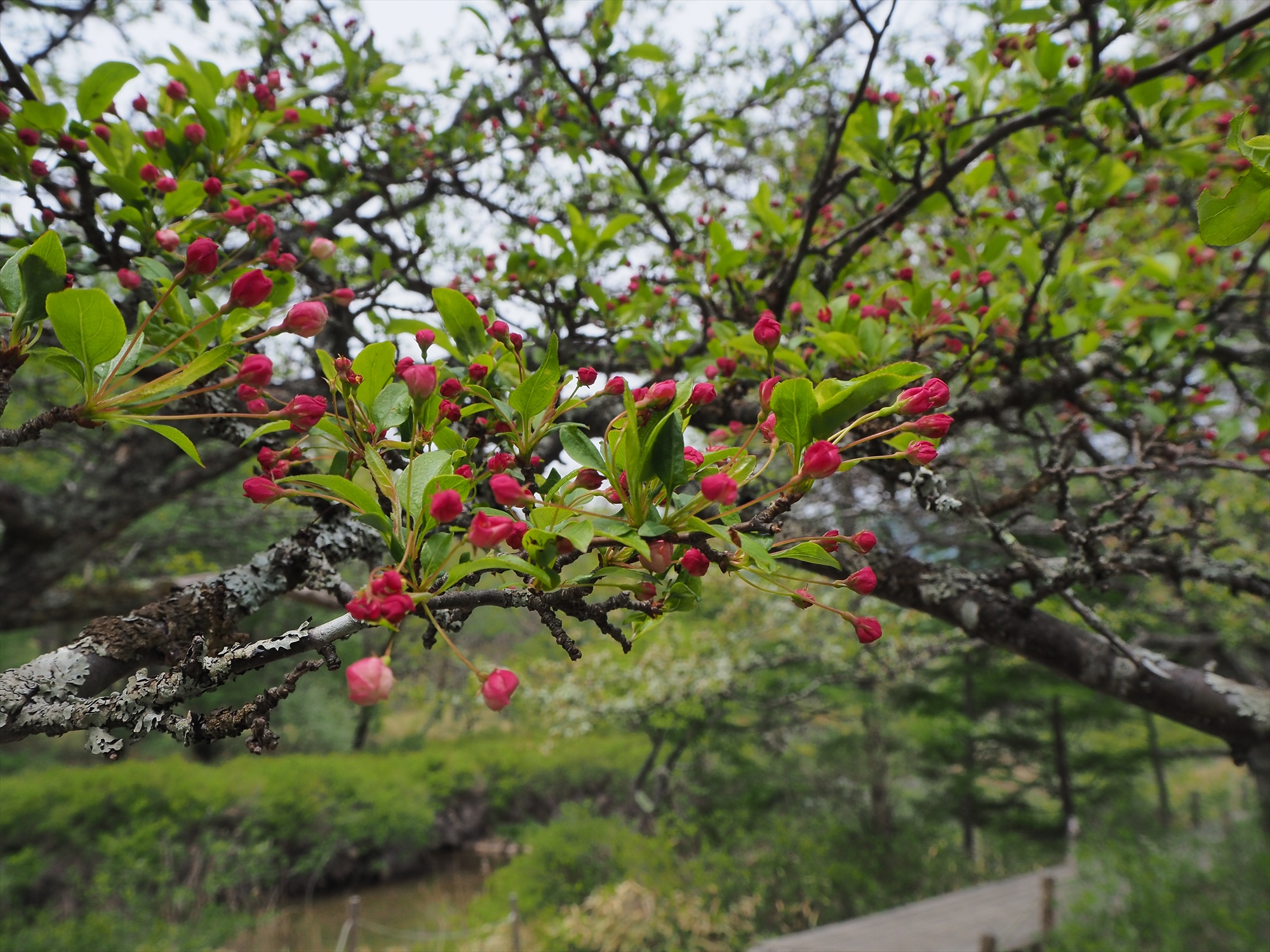 カラマツやズミ自身の新緑の中に、無数のつぼみの赤色が濃く映えて、新緑一色の戦場ヶ原でひときわ目立っていました。