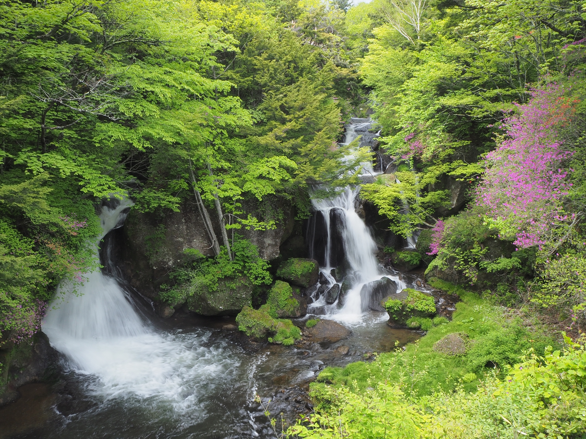 今年もたくさんお問い合わせをいただいた「竜頭滝のトウゴクミツバツツジ」も、最後のつぼみが開き切り、今週末が見納めかな、といった様子。