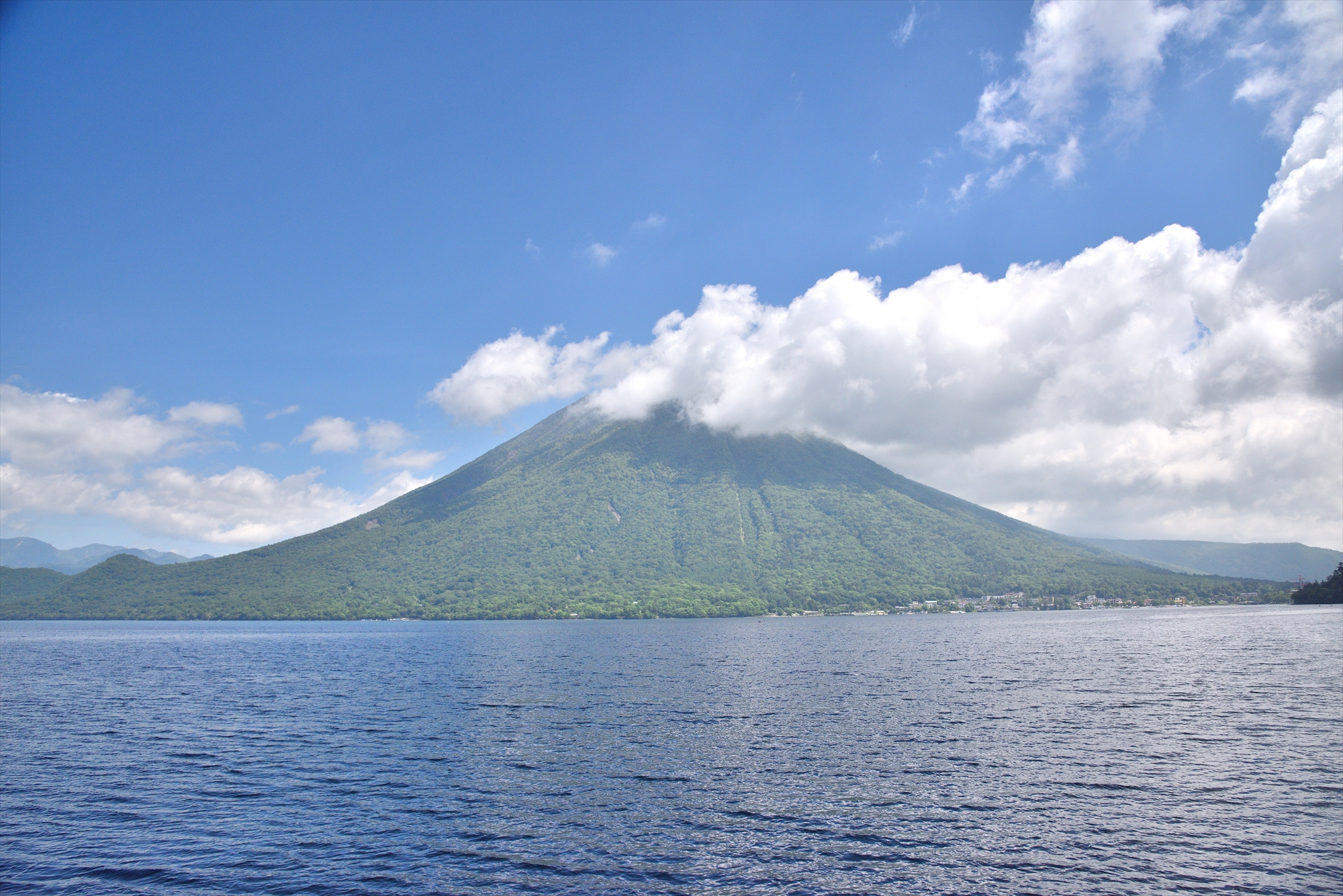 男体山が一番美しく見える角度と言われている大使館桟橋近くからの眺めなど、