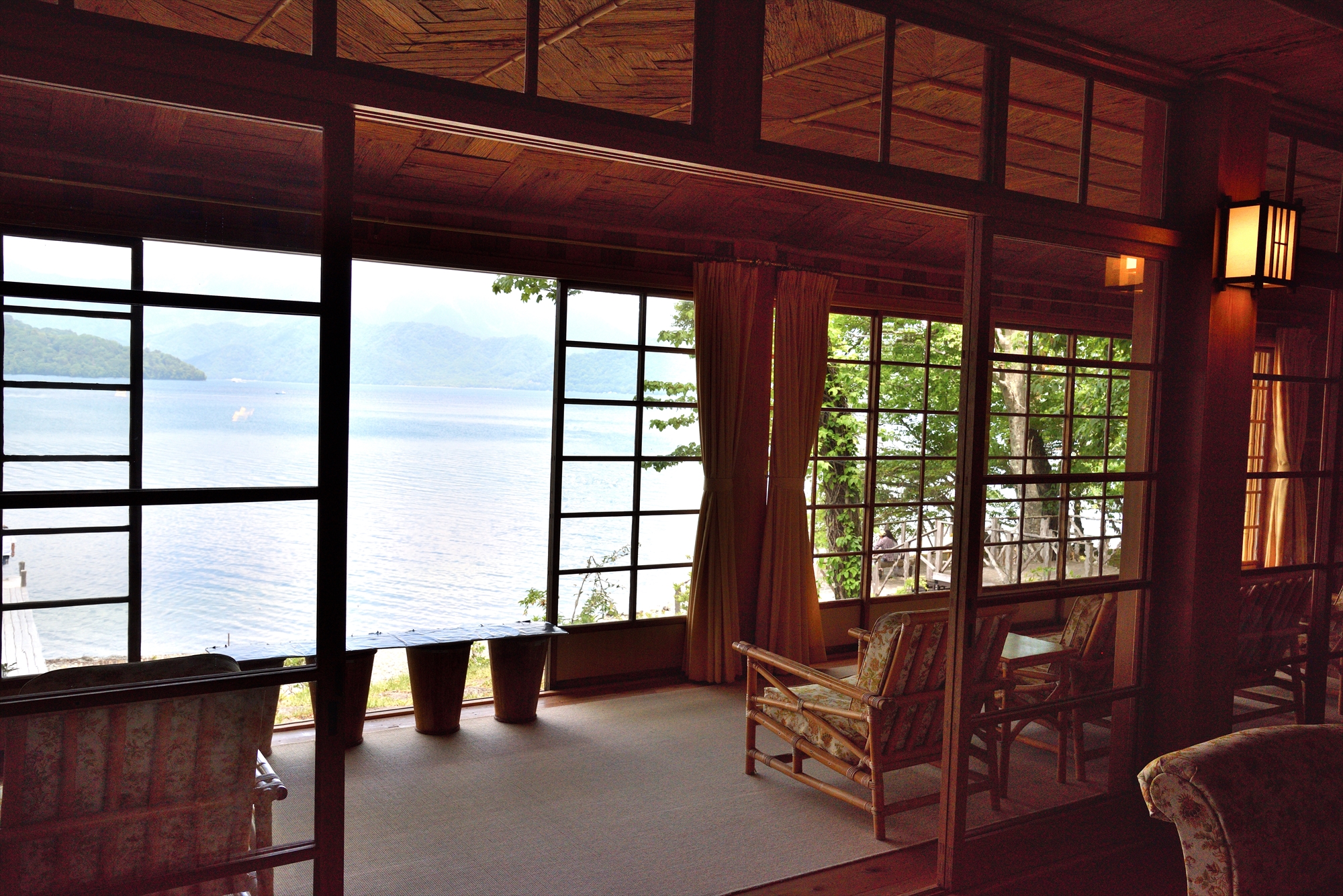 イタリア大使館ではソファーやいすに座りながら、目の前に広がる中禅寺湖をゆったりと楽しむことが出来ます。一日中座っていても飽きないほどの美しい眺めにうっとり。