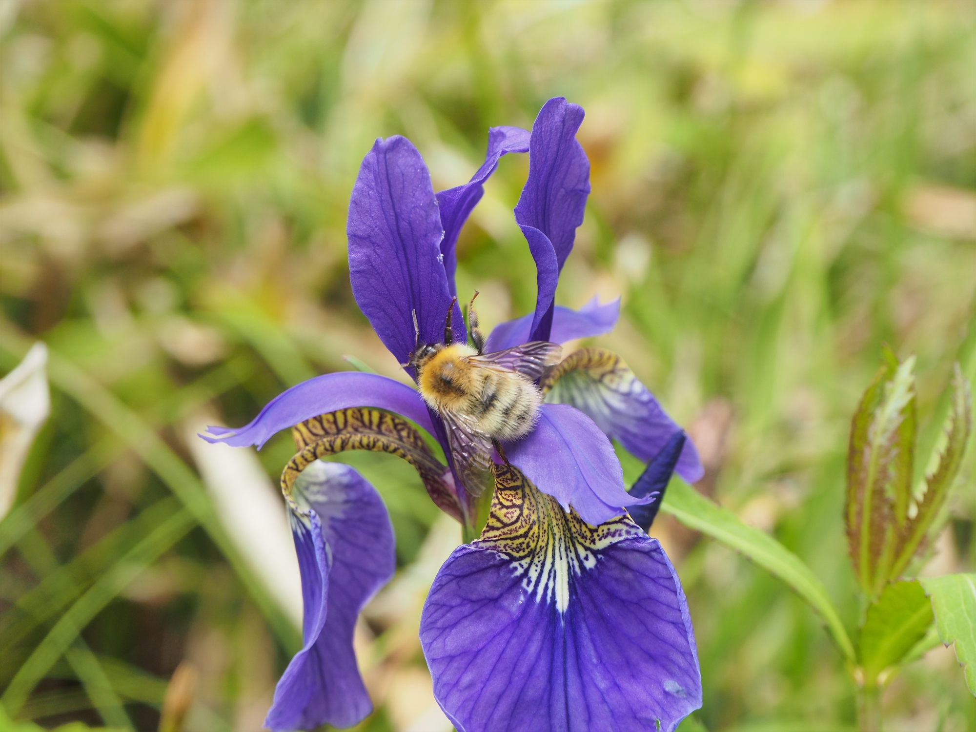 目にも鮮やかな濃紫色のアヤメが、この通り群生して咲き始めていますよー!!(2枚目の写真にはその蜜や花粉に夢中なマルハナバチさんも写しこみ♡)