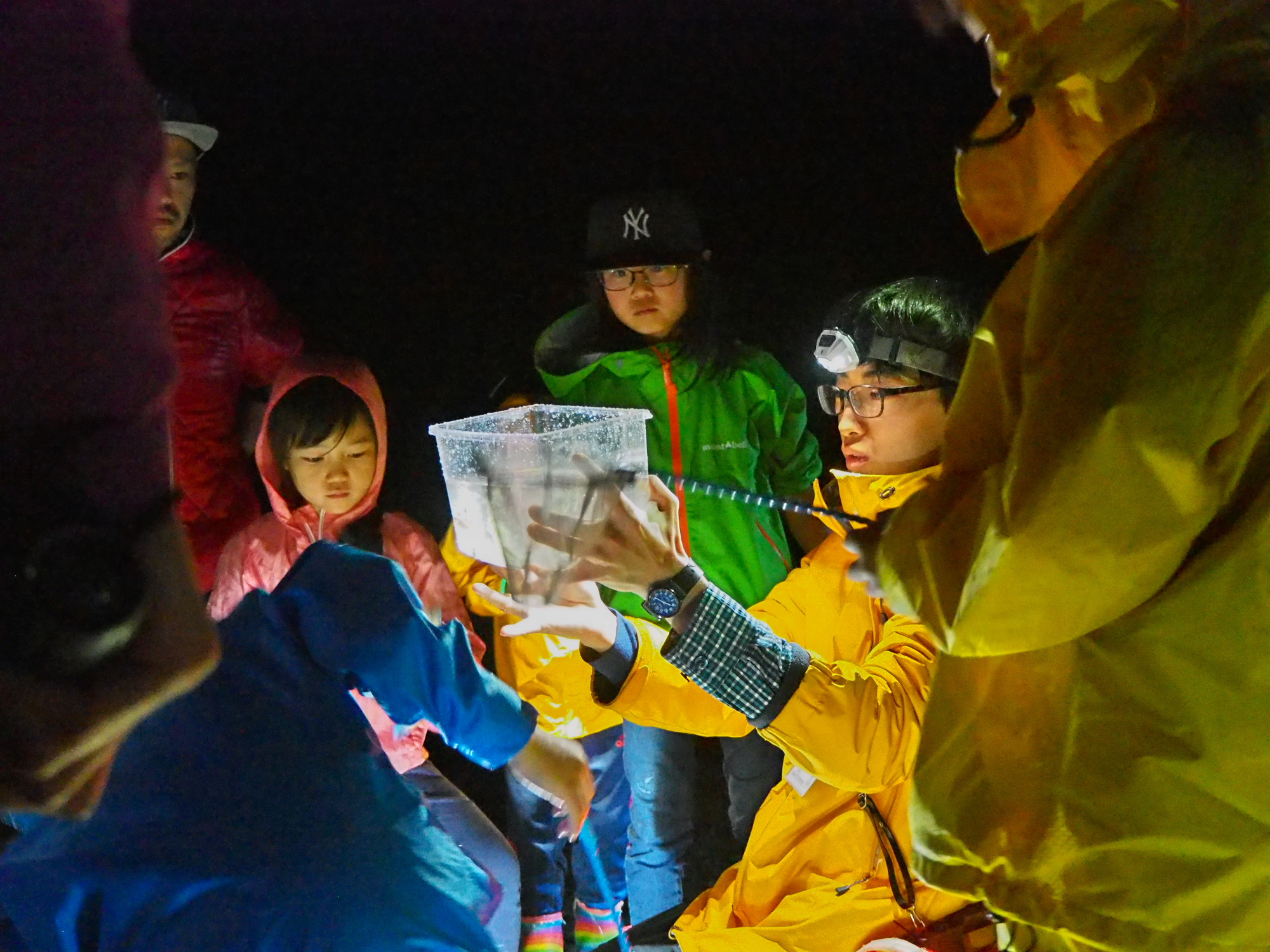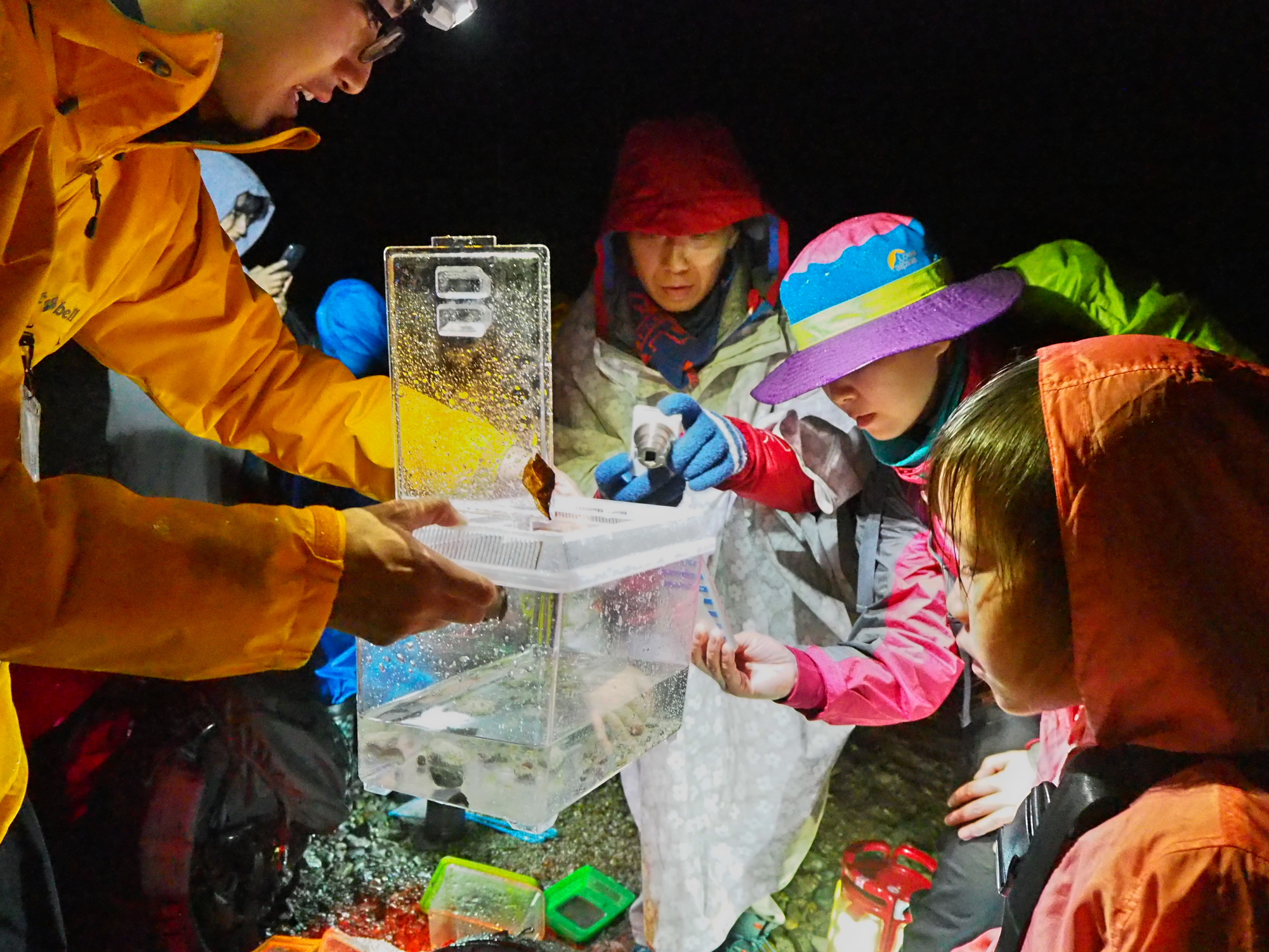 捕まえられた生きものはケースに入れて、ライトを当ててみんなで観察!