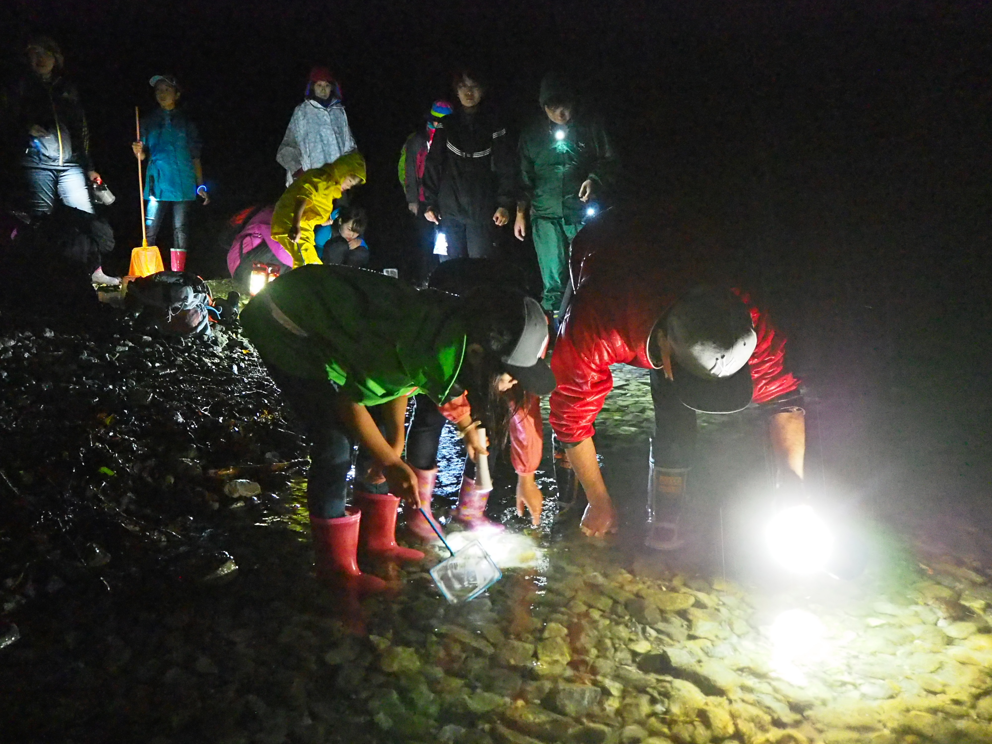 浜では、コウモリが水面を飛ぶ虫を捕る様子をライトで照らして観察したり、