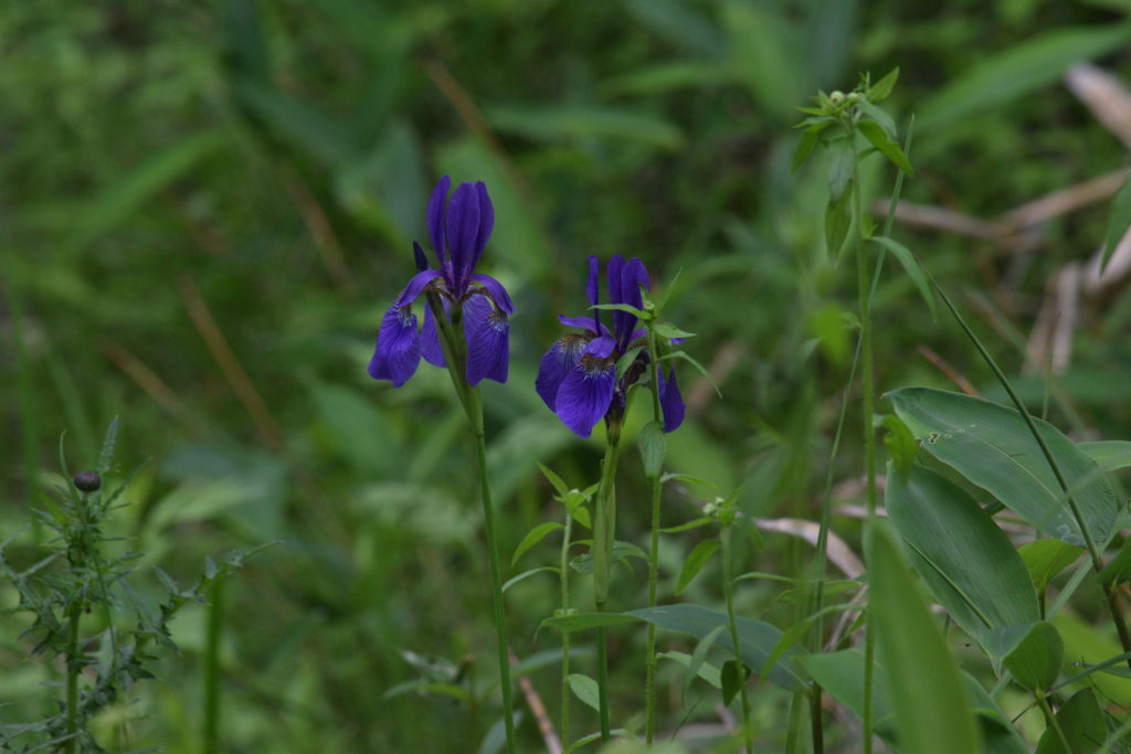 木道を歩いているとウマノアシガタやハクサンフウロといった花がちょうど見ごろを迎えていました。そんな中、特に印象に残ったのは、紫色の独特な剣型の花を咲かせるアヤメです。