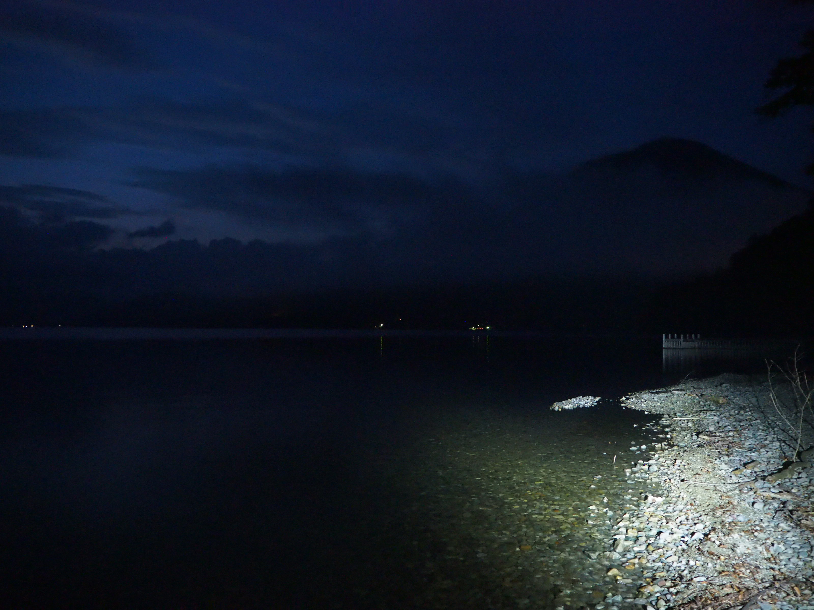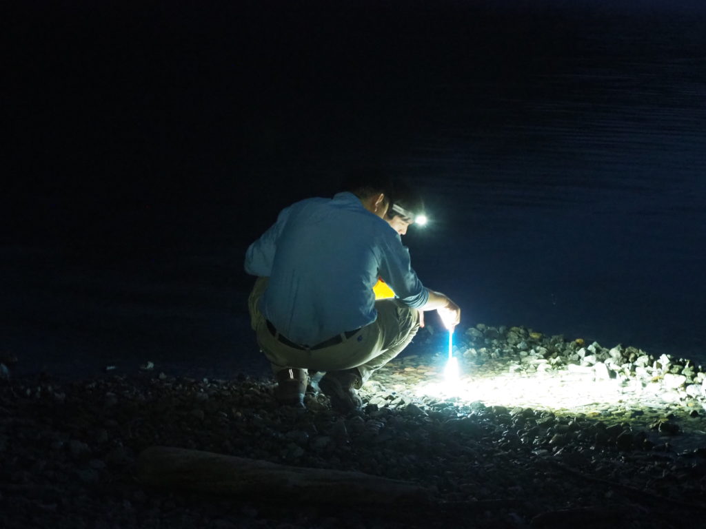 ライトを頼りに湖畔で生き物探し