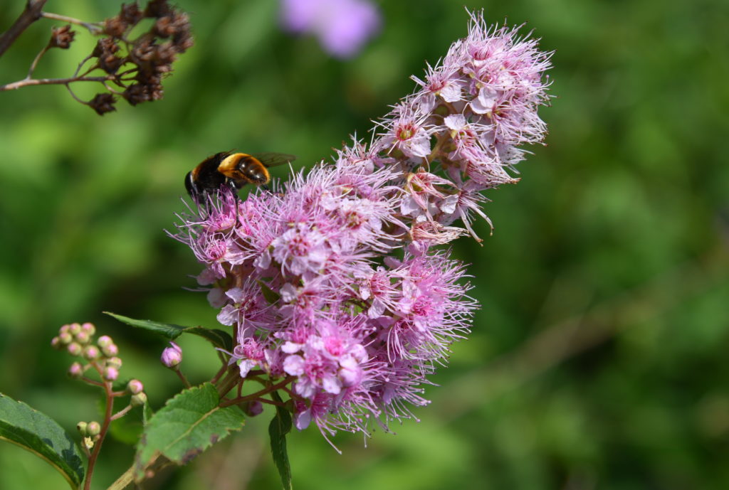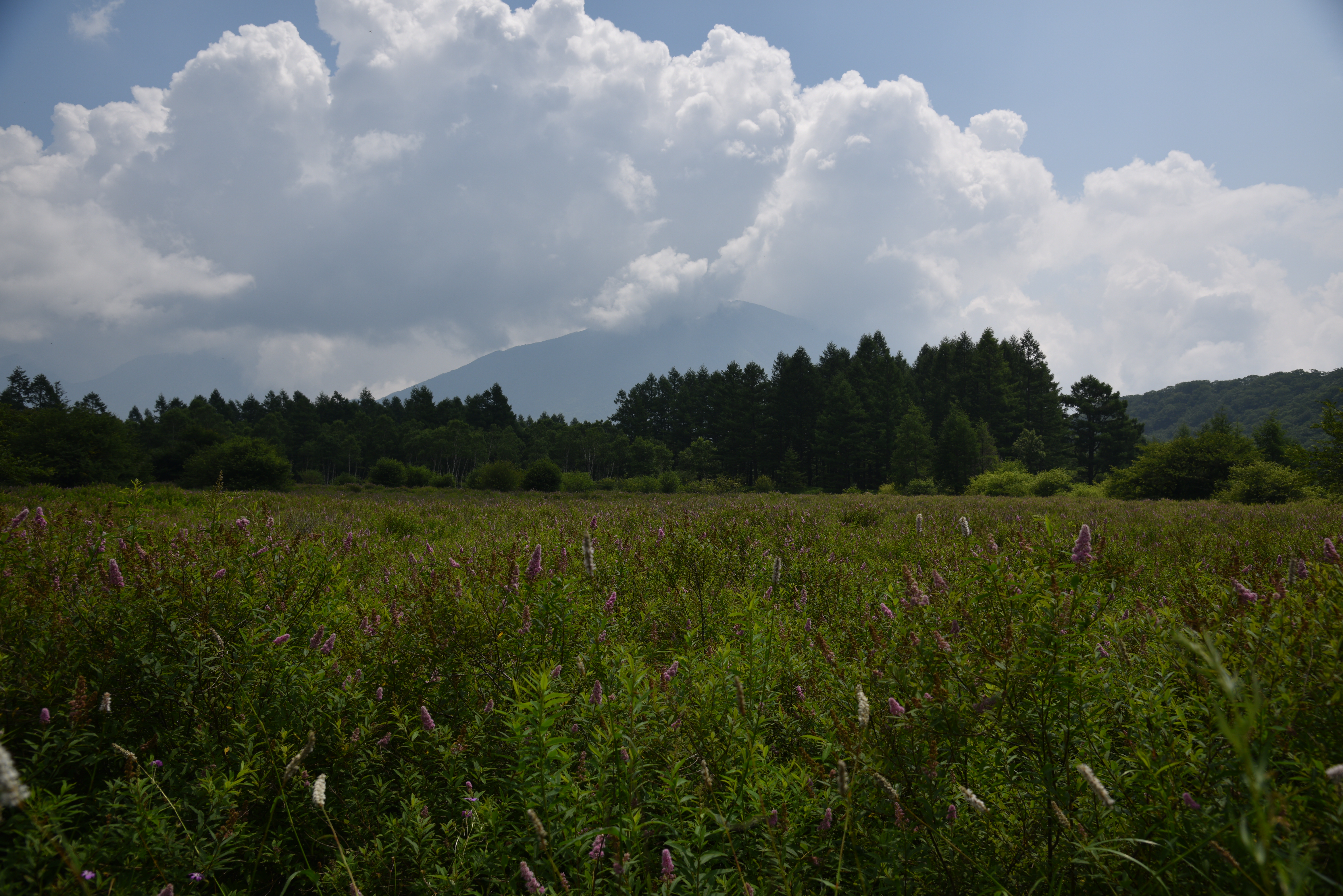 夏を感じさせてくれる入道雲をバックに、あたり一面に咲くホザキシモツケや