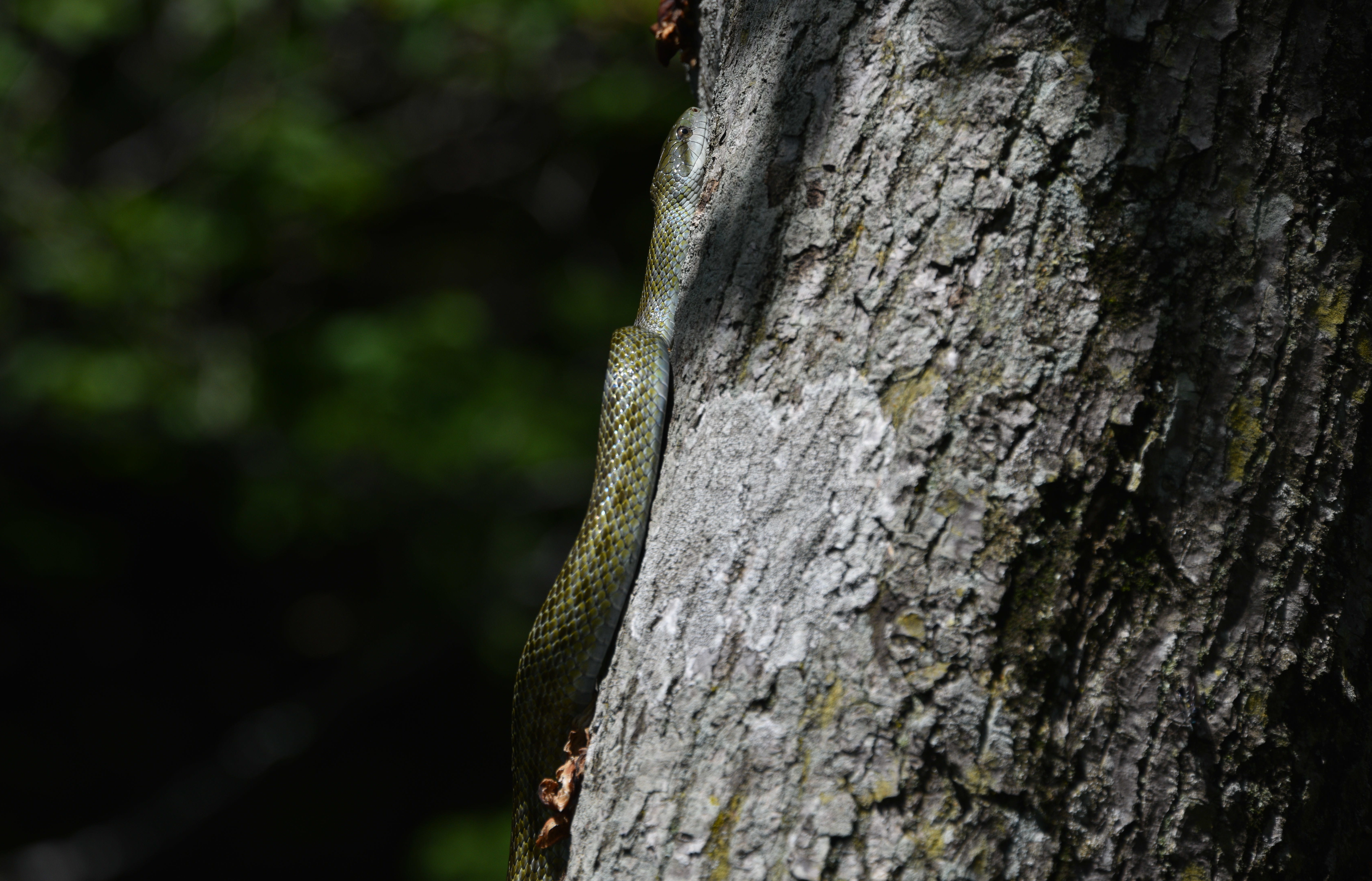 アオダイショウがいました。毒もなく、おとなしいヘビですが木登りが上手で、垂直な木でもおなかにある鱗をひっかけて写真のようにスルスルと登ることができます。