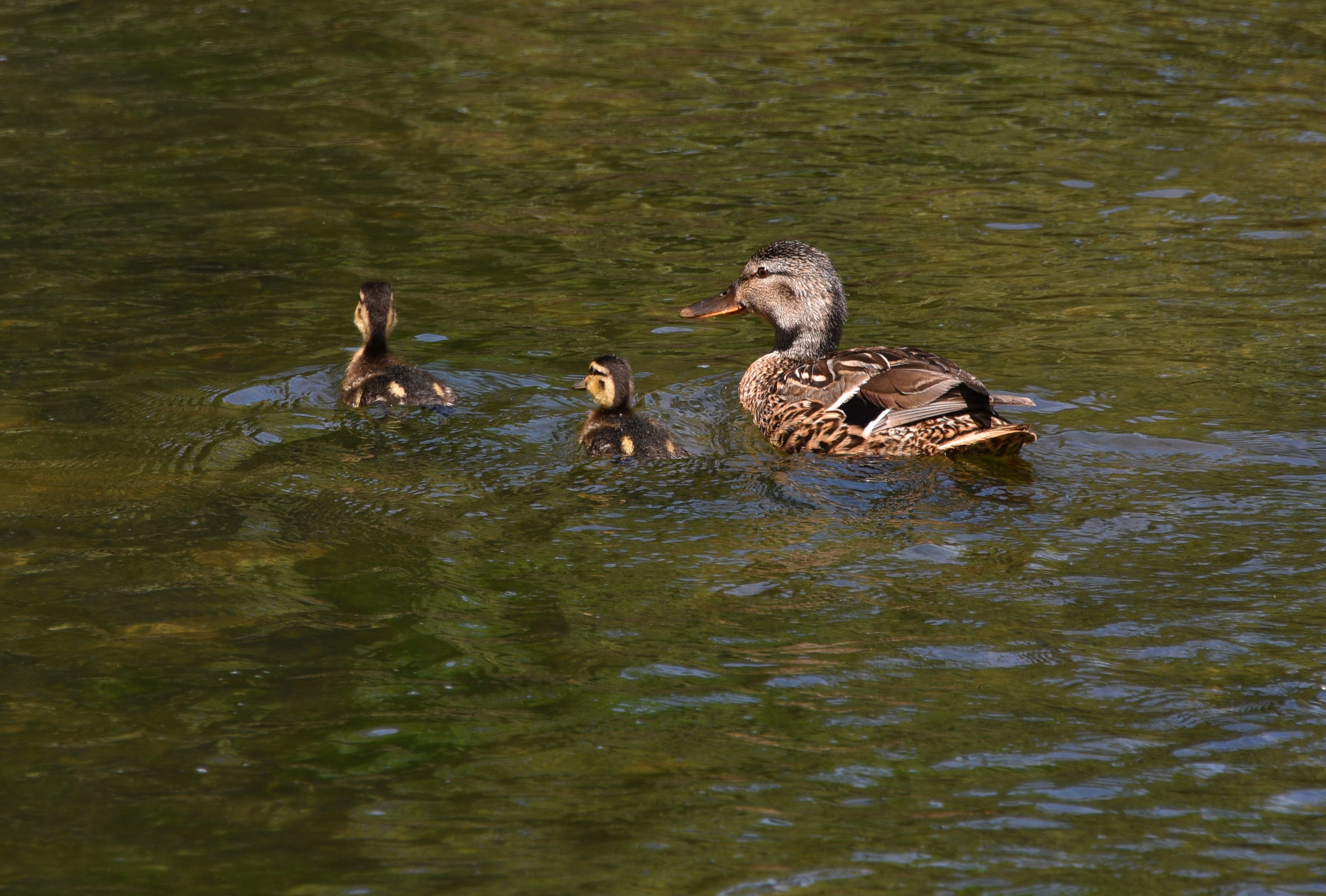 あちこちと泳ぎ回る雛にお母さん苦戦中です。