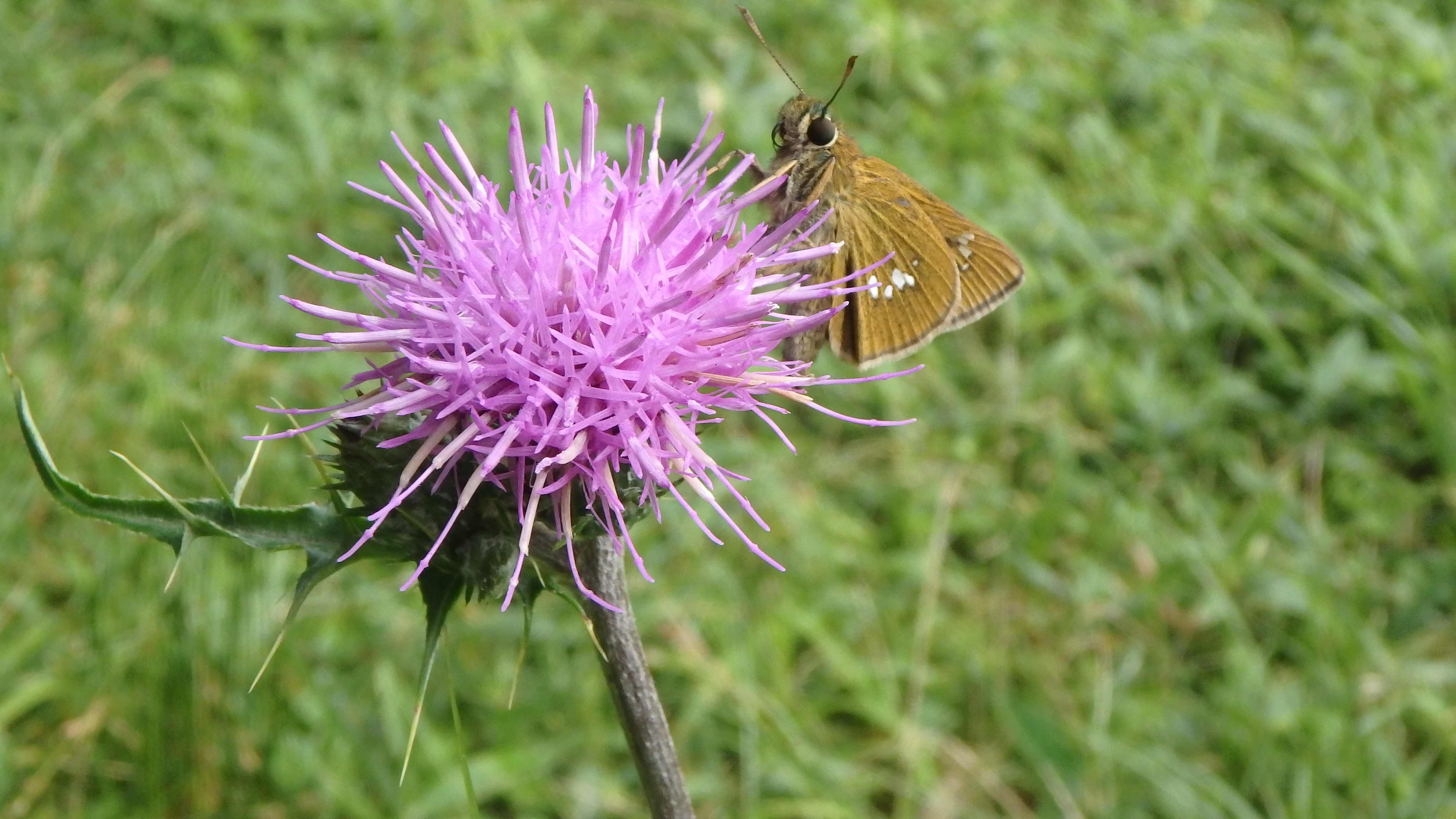 ノアザミの花がまだ残っていて、イチモンジセセリが花に集まっていました。