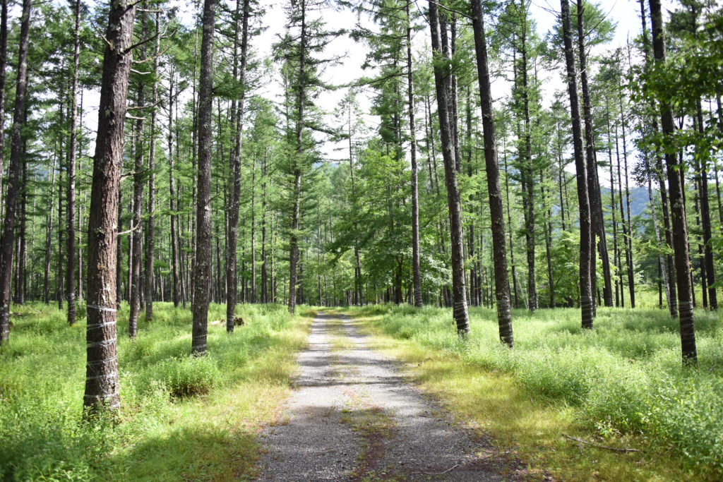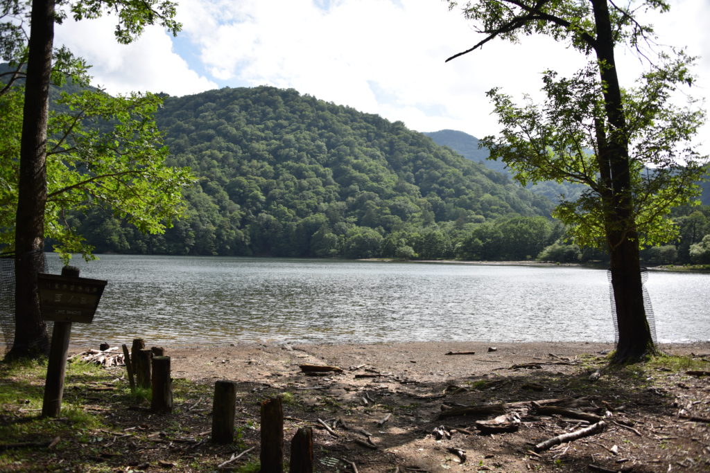 涼しい風が吹き抜ける中、新緑の広がるカラマツ林を抜けると西ノ湖が見えてきました。