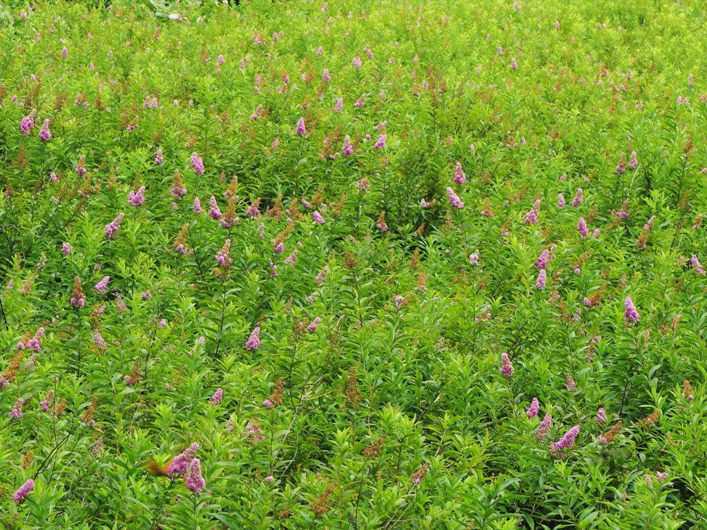じゃあもう花の夏は終わりか……ではありません。花が終わって実になっているものも多いですが、残ったホザキシモツケのピンクの濃いこと!