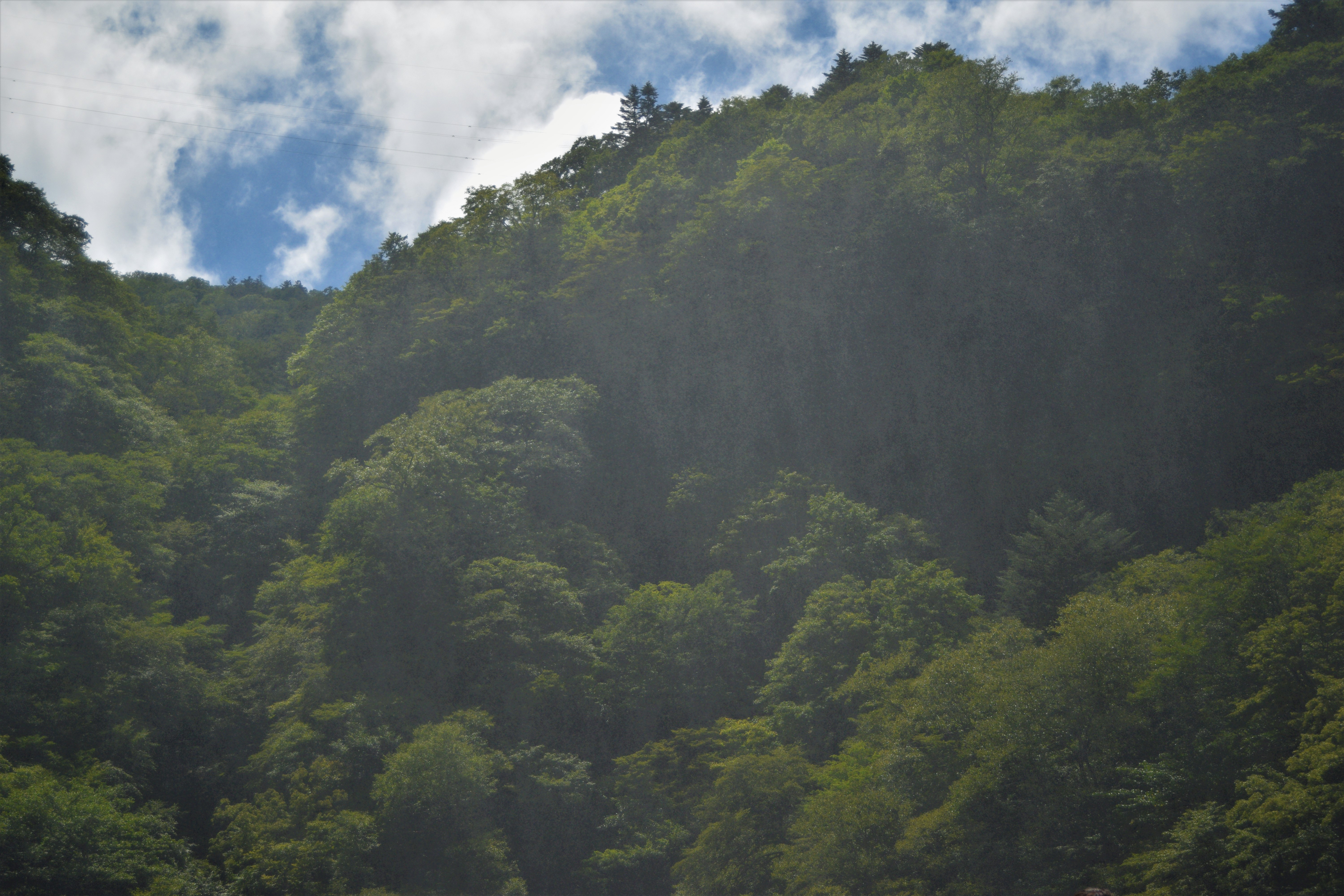写真では分かりにくい画像ですが、観爆台見上げると、晴れ間でもあるにかかわらず雨が降っているように見えます。
