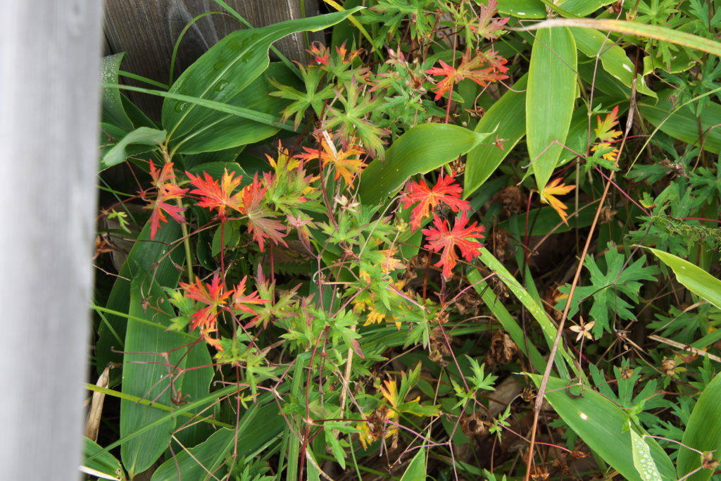 左の黄色い葉の写真はイタドリ。右の赤い葉の写真はハクサンフウロ。