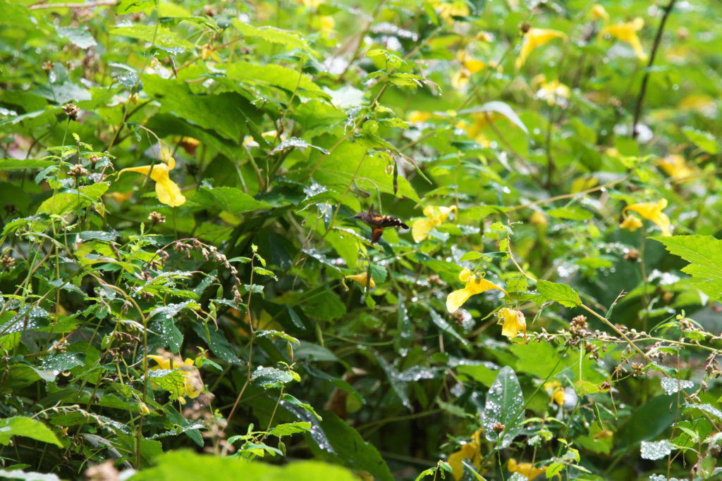 キツリフネの蜜を吸いに、ホシホウジャクと思しき影が。