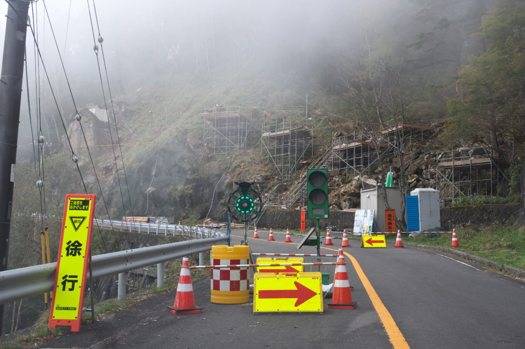 現在半月山展望台まで続く中宮祠足尾線(中禅寺湖スカイライン)が、仮設の信号機が複数個所設置され片側交互通行となっています。