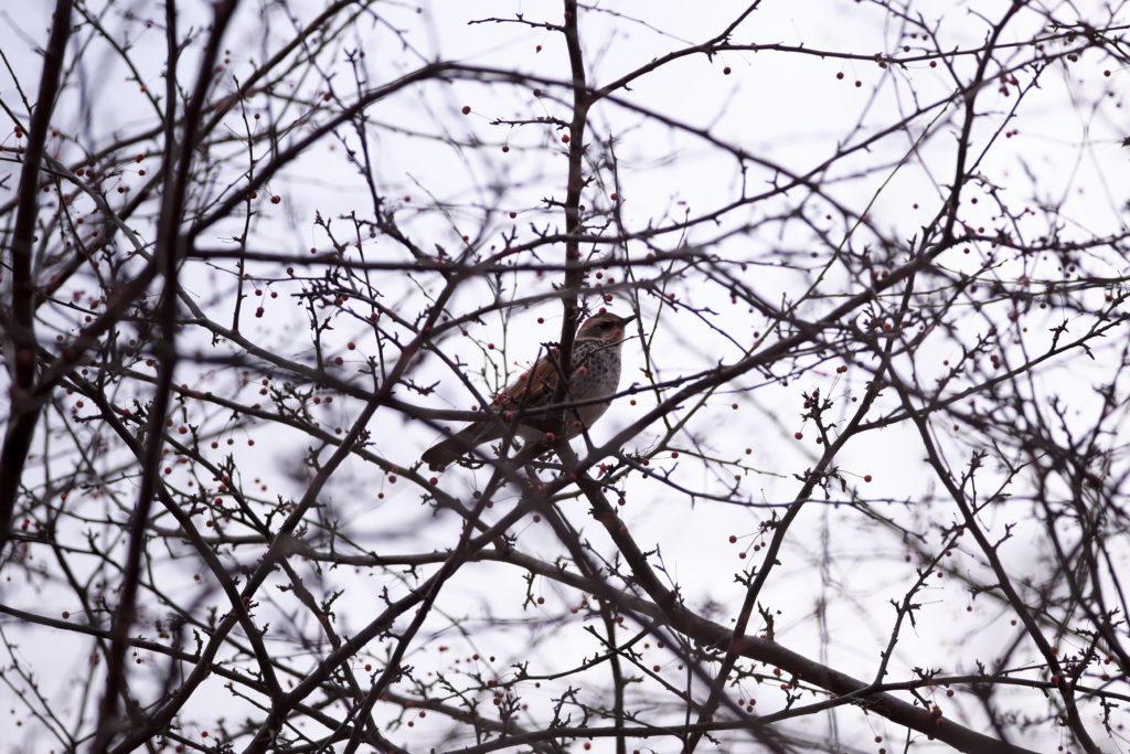 小田代原の遊歩道を歩いていると、ズミの実を食べに冬鳥のツグミがやってきていました。