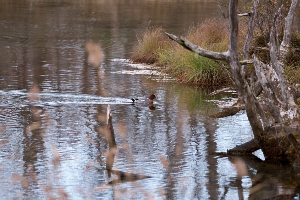小田代原から戦場ヶ原に向かい、泉門池に立ち寄ると、マガモなどと混ざり頭部の茶色いヒドリガモがいました。
