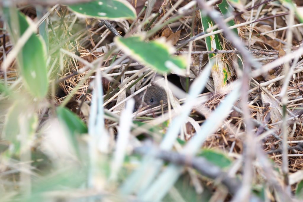 よーく観察していると枯れ葉の隙間からこちらの様子を伺っている小さなネズミと目が合いました。