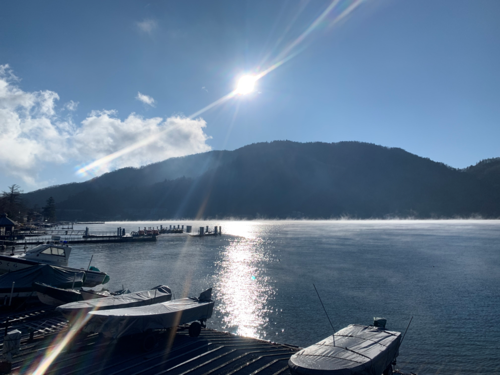 中禅寺湖では蒸気霧が出ていました。