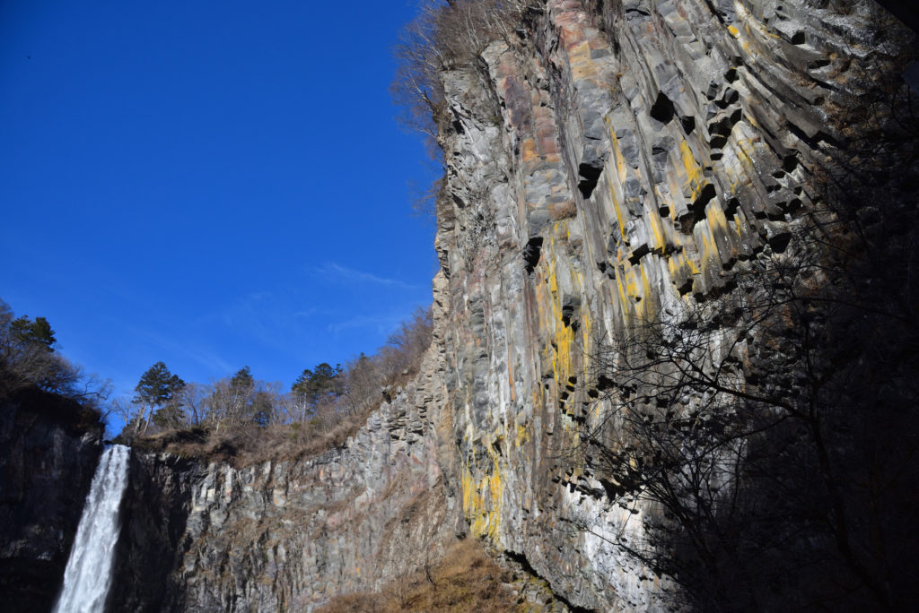 滝周辺の岩壁を広い視野で見ると、円柱状にくりぬいたようにくぼんでいるのがわかるでしょうか。実は、華厳滝やその下にある十二滝などの流水が、今でもこの岩壁を削りながら後退しているのです。