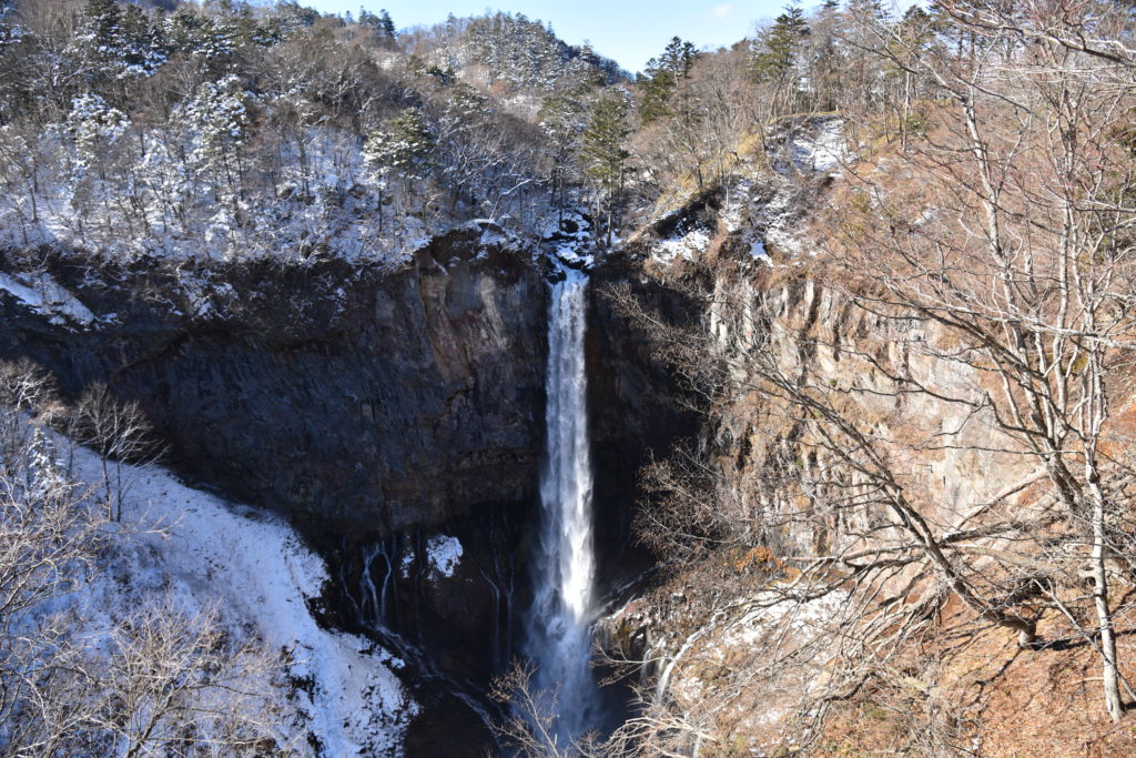 華厳の滝もこのとおりうっすら雪化粧。