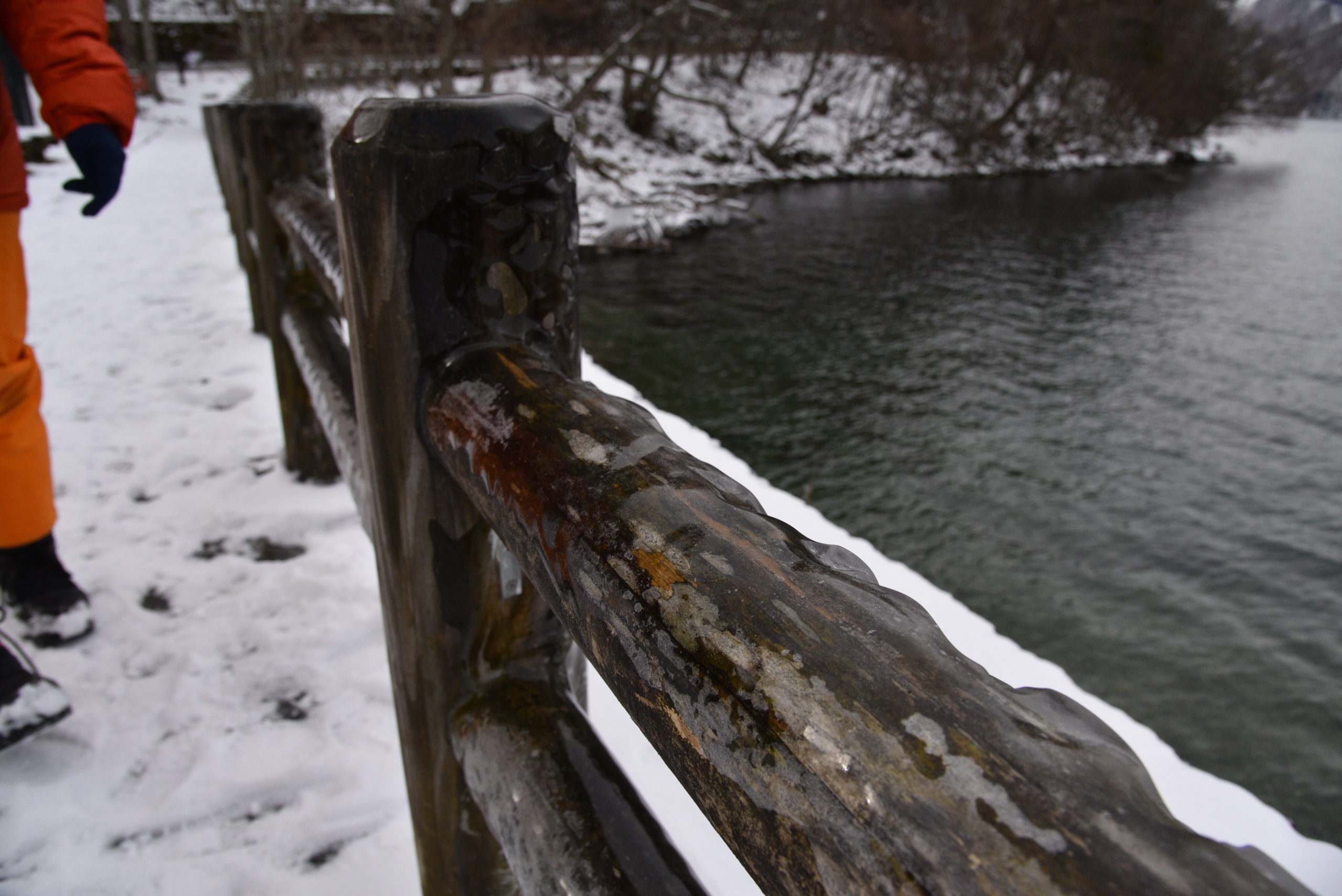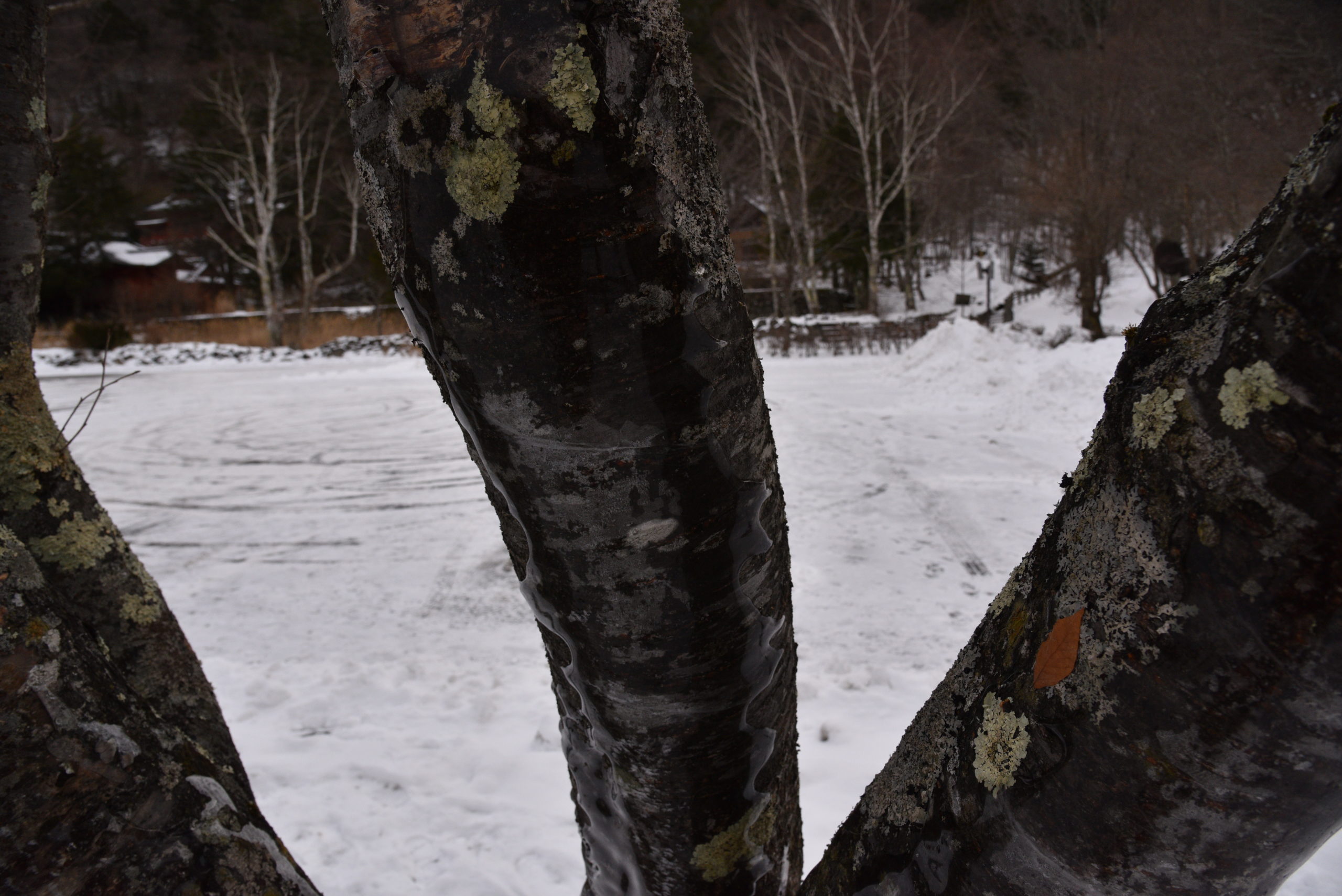 駐車場周辺の柵や木の幹にはつるつるとした氷の膜がうっすらと張っています。