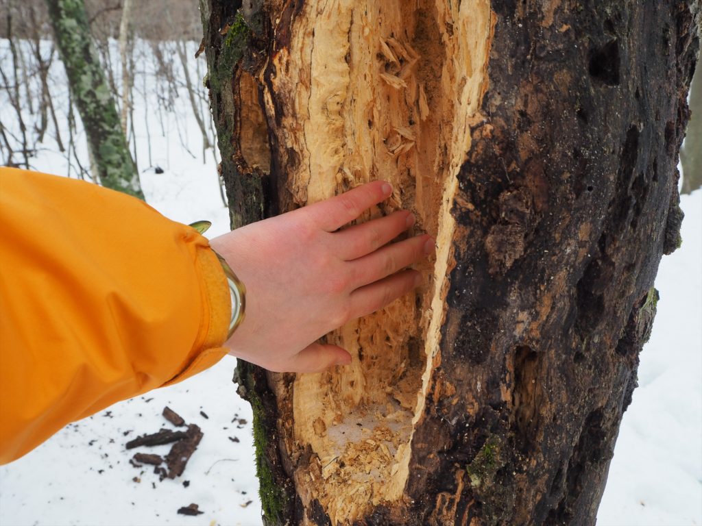 木屑が派手に散乱、深さ10cm以上ほじくられた跡も生々しい。キツツキの食べ痕でここまで大きな穴は初めて見ました。