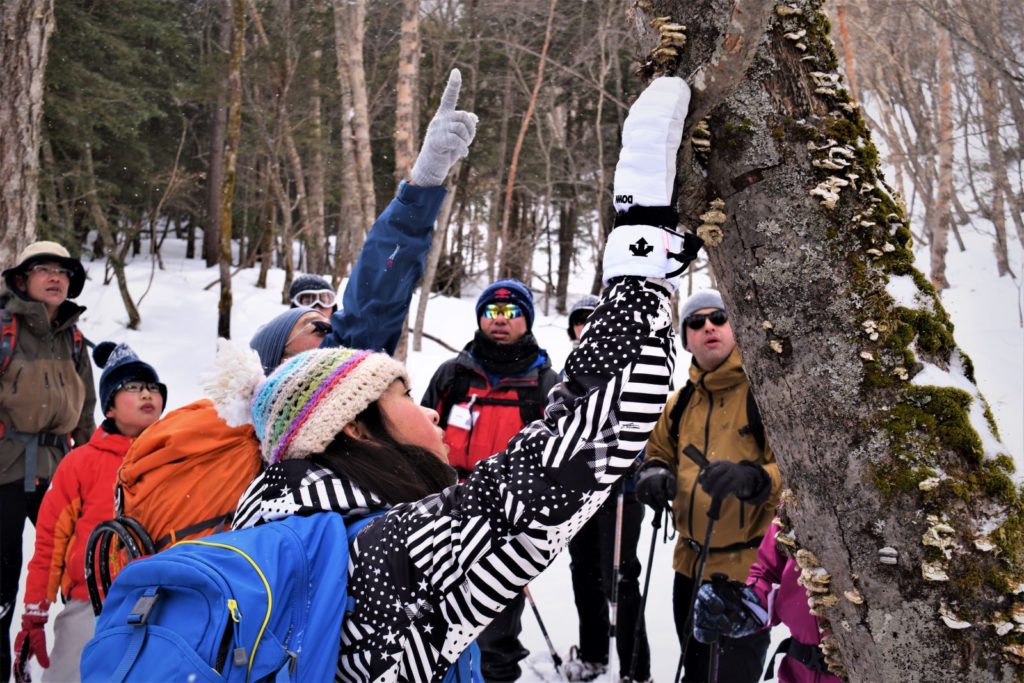 森を色々と深く知ることが出来るのも、当館解説員が同行するスノーシューイベントならではの楽しみの一つ。