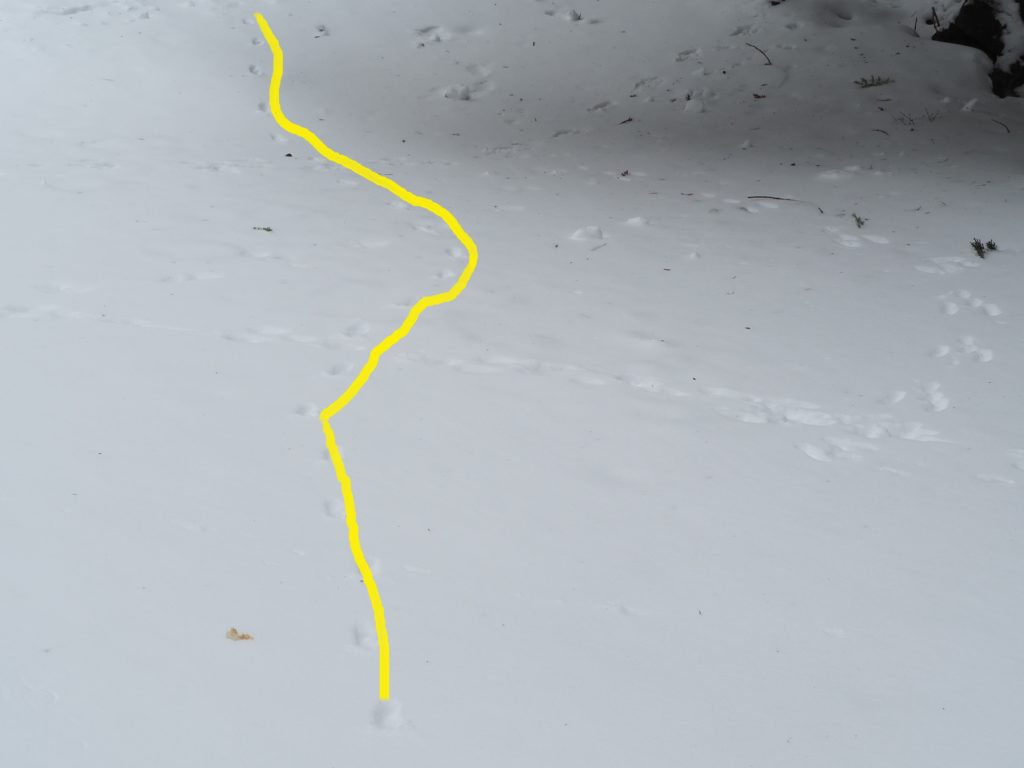 こちらの足跡はキツネらしき足跡(黄色い線を引いてます)と途中でぶつかっています。ぶつかり方からすると、どちらか一方が通った後にもう一方が通っただけのように思います。が、キツネ(捕食者)とウサギ(被捕食者)の組み合わせだと一瞬ドキッとしますね。