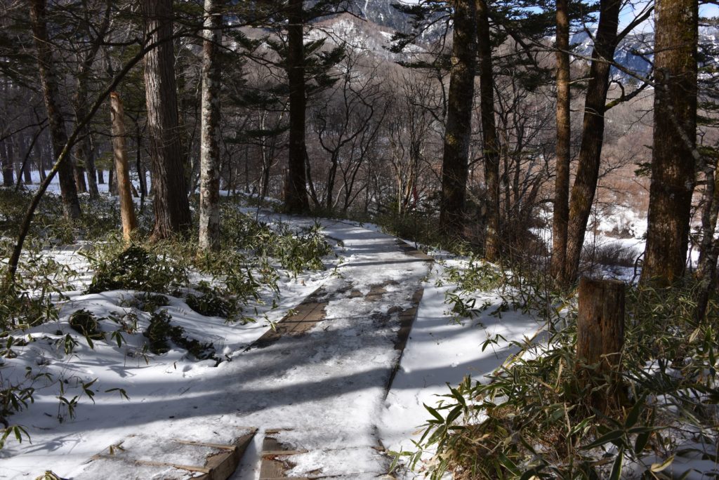 泉門池~青木橋間のごく一部の区間(下の写真)でのみ凍結箇所がありましたが、それ以外の区間では歩道上の雪がしっかり踏み固められており、スノーブーツのみで不自由なく歩くことができました。