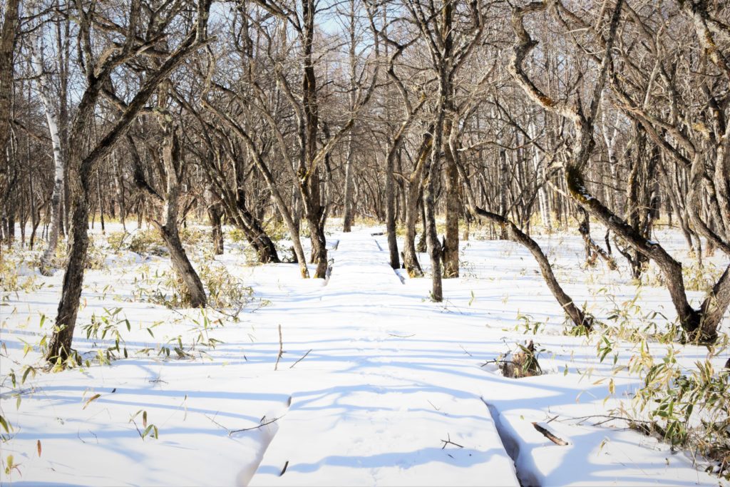 北戦場ヶ原の木道は未だ雪が積もっており、時折吹く風は冷たく未だ冬。