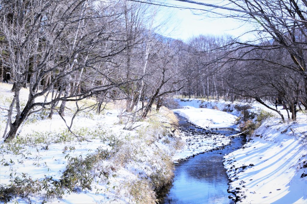 湯川の川岸も雪は積もっていますが、午前10時の時点で日差しが暖かく差し込んでなんとなく、