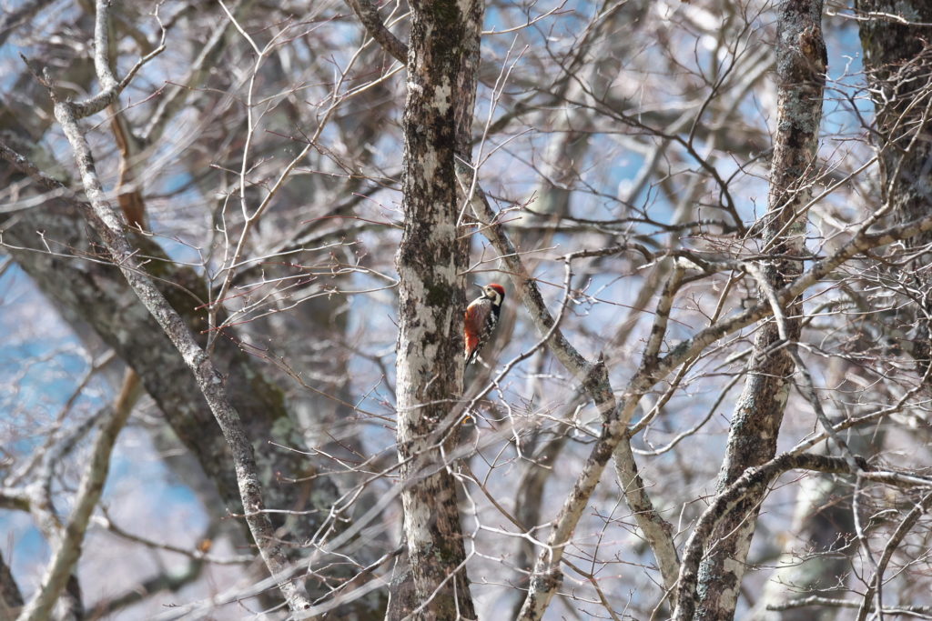 遊歩道を歩いていると周囲からアカゲラの「ケッケッ」という鳴き声が聞こえてきます。(上写真.オオアカゲラ)