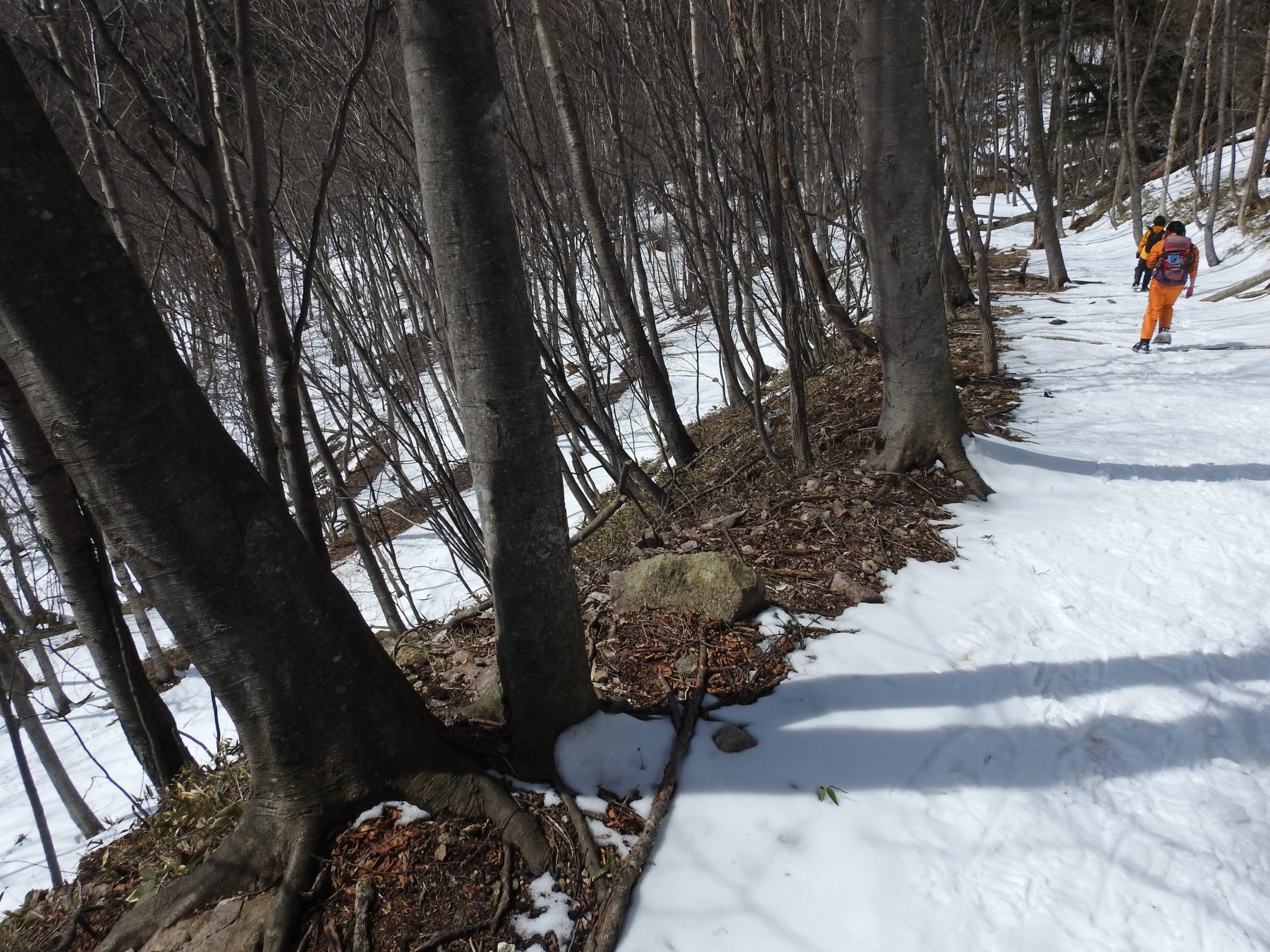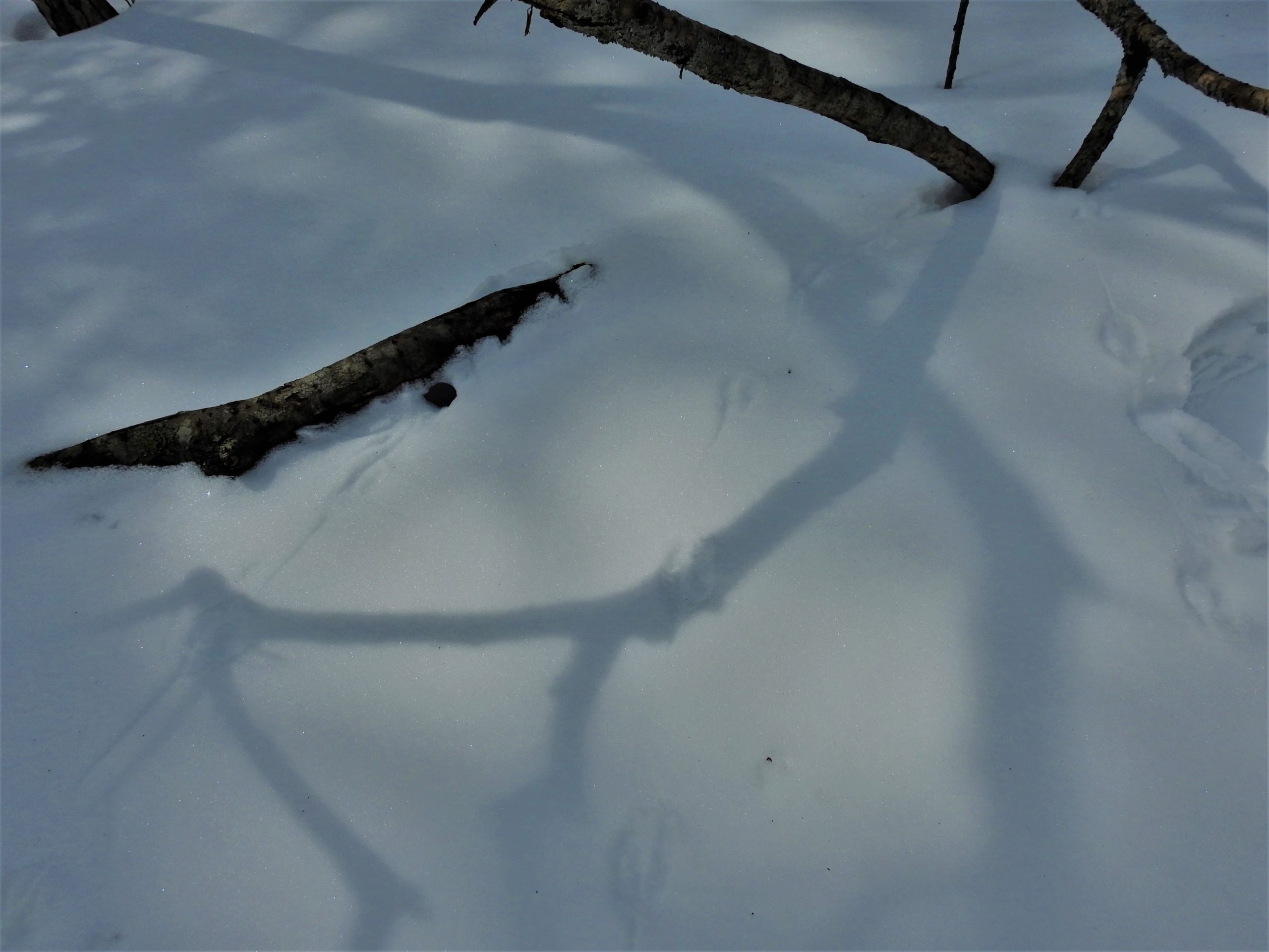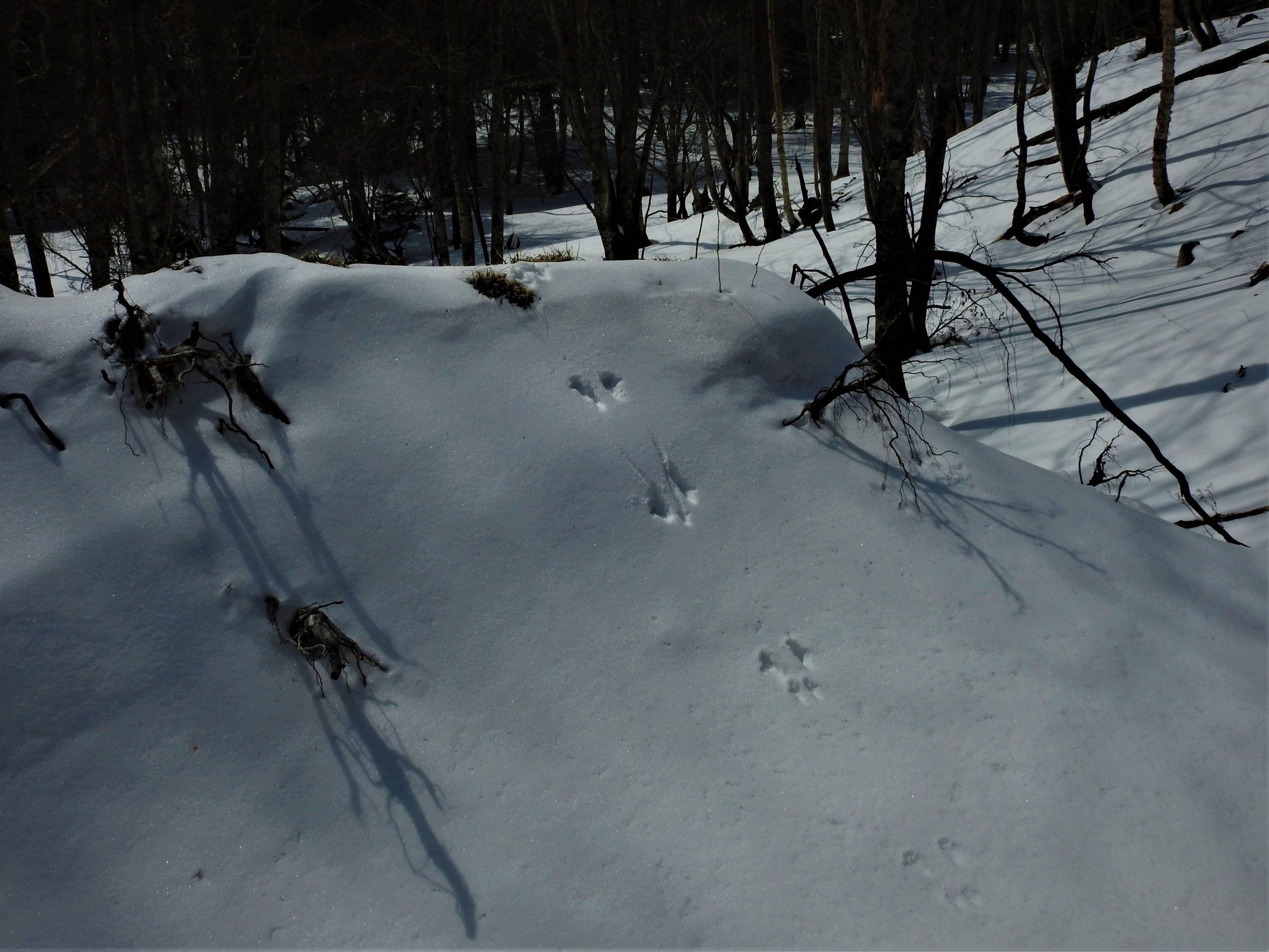 締まった雪の上に10cmほどの新雪が積もり積雪量は多い場所で50cm程度。しかし3℃と高い気温で新雪も水分を含み、柔らかいながらもスノーシューにくっつく雪質。地面が出た斜面を見ながら「今年は歩けて残り数回かな…」などと考えつつ歩くと…