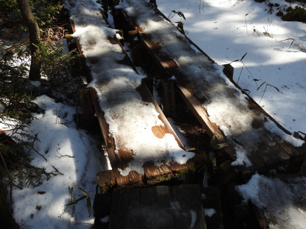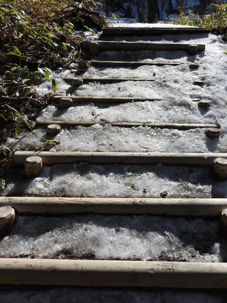 カマボコ状の雪が乗った木道や、雪でスロープのようになっている階段など、滑りやすい危険個所をいくつか確認しましたので、通行の際には充分ご注意を。